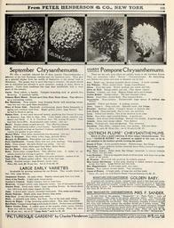 | Keywords: Everything for the garden (16391086135).jpg September Chrysanthemums <br> We offer a carefully selected list of these popular Chrysanthemums a <br> – election of the best European varieties and two American sorts These give <br> us a splendid display from the middle of September to the second week in <br> November The proper way to grow this type is outdoors; the plants should <br> not be disbudded but allowed to grow naturally making as many shoots as <br> possible Under these conditions this type does wonderfully well in most <br> parts of the country <br> Carrie Deep yellow; a beauty Compact branching style of growth free <br> flowering A standard variety <br> Crimson Marie Masse Bronze sport from Mme Marie Masse Very effective <br> as a contrasting variety <br> Fee Parisienne Deep mauve; long drooping florets with incurving center; <br> very free and very good when disbudded <br> Glory of Seven Oaks Practically everblooming plants flower frequently in <br> spring and continue until frost Bright golden yellow large flowers May <br> be had in bloom in spring <br> Golden Glow A very early incurved variety producing fine blooms 5 J inches <br> in diameter Aug 20th to Sept 10th Color bright yellow splendid sub- <br> stance and finish C S A Certificate Sept 7th scoring 90 points Take <br> bud July 1st to 20th An invaluable early variety See cut <br> Harrie Bronzy orange on gold ground Very effective coloring <br> Leslie Rich buttercup yellow a real beauty Splendid habit <br> Lillie Pearl pink as large as Goacher's Crimson splendid habit An excellent <br> variety for garden or pot culture <br> Market White Pure white wonderfully free blooming See cut <br> Mme F Bergman Pure white a fine large globular flower <br> Marquis de Montmort Pure glossy rose and silvery white <br> Perle Chatillonaise Creamy white with rosy pink shadings Very attractive_ <br> Polly Deep orange; the early flowers are amber See cut <br> Ralph Curtis Creamy white sport from Mme Marie Masse <br> Roi des Blancs Pure white; one of the best <br> Rosie Terracotta; a large flower Very effective color It makes an ex- <br> cellent variety for cutting in sprays See cut <br> Tapis de Neige Pure white; flat flowers in great profusion; earliest of all <br> Tapis d'Or Brilliant golden yellow One of the very best <br> Tonkin Reddish orange; large flowers; lovely color <br> Price 20c each 2 00 per doz Set of 19 for 3 00 <br> LARGE EARLY VARIETIES <br> Invaluable for growing outdoors for cut flowers They usually bloom by <br> Oct 15th large flowers <br> Clementine Tousset An early white Slightly tinted pink from late buds <br> Glory of the Pacific A light pink broad petals <br> Goacher's Crimson Bright crimson best in bush form <br> Monrovia A bright yellow early Japanese variety One of the easiest to grow <br> October Frost Good early white; large spreading flowers In bloom about <br> Oct 10th from buds taken August 10-12th <br> Opah A grand early variety beautiful blush-pink Fine stems and foliage <br> Pacific Supreme Bright pink large flowers long stems <br> Polly Rose A very fine and large early white <br> Pride A splendid early white; fine form One of the best early whites <br> Reveil de Beiges A big incurving golden-yellow Fine when disbudded <br> Roi d'ltalie Compact incurving; a rich shade of yellow Perfect stem and foliage <br> Yellow October Frost A yellow sport of the popular white variety October <br> Frost that will be found very valuable for early cutting Price 15c each <br> 1 50 per doz ; set of 12 Large Early sorts for 1 50 <br> hardy Pompone Chrysanthemums <br> These are the only sorts which are reliably hardy in the Northern States- <br> They are sometimes called Button Chrysanthemums By disbudding <br> nice flowers two inches and more in diameter can be had <br> Acto Bright rose showing beautiful silvery reverse A lovely contrast <br> Ada Williams White shaded blush Large round flowers <br> Aileen Deep lilac-pink Flower medium size round and full <br> Arbre de Noel Orange-yellow and red Very showy variety <br> Dundee Crimson very deep Elegant foliage and a good keeper <br> Golden Bedder Golden-yellow The best standard yellow <br> Hester Pearl-white shaded flesh Fine rounded flower <br> Jacquenette Rosy-carmine Exceptionally large sprays of medium ilea <br> flowers <br> Jeanette Yellow and bronze A striking contrast <br> Jules Lagreve Deep rich red Splendid habit fine foliage <br> Klondike Brilliant yellow Compact blooms of medium size <br> Lady Duvol Deep rosy-pink; fine in color size and form <br> Leroy Yellow and bronze One of the showiest in its color <br> Nydia Pure white high rounded flower A grand sort <br> Ontario Pink silvery-white shadings Flowers very double A perfect gem <br> Quinola Deep clear orange yellow Very distinct <br> Rufus Venetian red; deep and glowing Very attractive <br> Snowdrop Pure white; compact form very profuse The best white <br> Price 15c each 1 50 per doz ; set of 18 sorts for 2 25 <br> OSTRICH PLUME CHRYSANTHEMUMS <br> Below we offer a grand collection of those unique Chrysanthemums The <br> term OSTRICH PLUME we originated as applied to this type so as to <br> call attention to the feathery growth covering the petals <br> Beauty of Truro A rich purplish-bronze Flowers large; fine foliage <br> Eiderdown Large perfectly double incurved snow-white covered with gland- <br> ular hairs stiff stems <br> Hon Thos Lowry Habit short fine foliage; incurved; a curious mixture <br> of yellow red and rose <br> Louis Boehmer This is an exquisite shade of silvery-pink with deep rose on the <br> inside of the petals <br> M Fromont Fine dark red incurved beautifully plumed <br> Miss Louise Hartshorne A fine pink shading to yellow towards the center; <br> petals very hairy Large flowers and fine form <br> Mrs Higginbotham A rich bright pink very hairy <br> Ondine Rosy salmon reverse amber Very attractive <br> Queen of Plumes A bright pink; of large size and fine build <br> Price 15c each