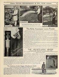 | Keywords: Everything for the garden (16391145225).jpg Fr sm PETER HEMDEMOM <br> O MEW YOIRH <br> The Kirke Automatic Lawn Feeder <br> It applies the fertilizer while watering and feeds the grass or garden with high grade immediately <br> available concentrated plant food See cuts- Nos 1 and 2 <br> The Kirke fertilizer dispenser is a neat device easily attached to any garden hose It will last <br> a life time and can be used both for Kirke Fertilizer and Insecticide cartridges See cut No 4 <br> The cartridge stick of Concentrated Fertilizer for the lawn and garden and the Nicotine Cart- <br> ridges for the destruction of soft bodied insects dissolve in as much water as will pass through the <br> ordinary garden hose in about five hours They are clean odorless and nonpoisonous and will give <br> perceptible results after one weeks use on the lawn or in the garden <br> The cartridges that fit into the feeder are prepared from the highest grade of concentrated fertilizer <br> absolutely soluble and quick acting A combination to make plants grow and flourish keep the grass <br> green and the flowers in bloom Its available elements of plant food in one tablet are equal to at least <br> SO lbs of good stable manure but contains none of the impurities such as odor unsightly refuse or- <br> seeds of weeds not to speak of the amount of labor required first in distributing and later in removing; <br> the undissolved refuse <br> The fertilizer cartridge is sufficiently hardened to prevent a too rapid wasting but is thoroughly <br> dissolved as it leaves the nozzle or lawn sprinkler and is therefore in a condition to be readily absorbed <br> by the roots of the plants or grass ' <br> The nicotine cartridge is made from a free nicotine which when applied to both indoor and out <br> door vegetation acts as a preventive against aphis thrip green fly rose bug mealy bug etc <br> Price Kirke Fertilizer and Insecticide Dispenser nickel plated as shown in cut No 4 3 00 <br> Mail weight 2 lbs- <br> Price Kirke Fertilizer and Insecticide cartridges S3 00 per dozen Mail weight 8 lbs <br> THE VELVETLAWN SEEDEFv <br> A VALUABLE NEW MACHINE FOR SEEDING NEW LAWNS <br> Also for renovating worn out lawns and bad spots Puts the seed IN old sod or IN newly prepared <br> ground covers and rolls it <br> The Velvetlawn Seeder is a valuable new machine for seeding new lawns and doubly valua- <br> ble for renovating worn out lawns and bad spots in Greens Tennis Courts etc without redigging or <br> plowing and without marring the surface It puts the seed <br> IN newly prepared ground or IN old sod the seed is dis- <br> tributed very evenly in any desired quantity wind or no wind <br> not too thick in some places and too thin in others In new <br> ground or soft turf it is easily operated by one man but in old hard sod it may require another person to pull The <br> revolving discs cut narrow trenches the seed being sown in it and immediately behind the discs There are eight of these <br> discs with their accompanying seed spouts These sow 2 inches apart putting the seed in at any desired depth thus the <br> machine sows a strip 16 inches wide as fast as a man can walk It will sow and cross sow an area 50 x 150 feet in thirty <br> minutes a little roller follows each seed spout thus pressing the soil back and covering the seed As each <br> disc seed spout and roller work individually they therefore adapt themselves to the inequalities of the <br> ground insuring a perfectly even stand of grass Price Hand Power Velvet Lawn Seeder complete with <br> press wheels net 15 00 <br> The Henderson Double Hopper Wheelbarrow Seeder <br> Sows Grass Seed Mixtures as well as Heavy Seeds or Light Chaffy Seeds <br> This is a superior Seeder One side of the Seed Box is adapted for all such heavy seeds as clover timothy; <br> millet alfalfa Hungarian etc The opposite side handles the light chaffy <br> seeds as Red top Kentucky blue Orchard grass etc as well as grass seed <br> mixtures for golf pasture hay lawns etc The machine may be easily regu- <br> lated to sow any desired quantity per acre sowing it accurately and evenly <br> the whole length of the hopper 14 feet and it does not clog up The total <br> weight of thj machine is only 40 pounds The hopper is perfectly balanced <br> and is close to the large wheel giving greatest force with least exertion <br> and leaving light weight on the operator Every machine warranted to do <br> good work and of especial value on a windy day Full directions with each <br> seeder Price 110 00 <br> THE KIRKE FERTILIZER DISTRIBUTOR 43874977 149634 78295 Page 185 Text http //www biodiversitylibrary org/page/43874977 c1915 10 5962/bhl title 78295 Henry G Gilbert Nursery and Seed Trade Catalog Collection ; Peter Henderson Co Biodiversity Heritage Library Everything for the garden 1915 Garden Stories Books Bulbs Plants Catalogs Equipment and supplies Flowers Gardening Lawn mowers Seeds U S Department of Agriculture National Agricultural Library bhl page 43874977 dc identifier http //biodiversitylibrary org/page/43874977 bhlGardenStories BHLinbloom bulbs plants u s department of agriculture national agricultural library bhlgardenstories bhlinbloom Information field Flickr posted date ISOdate 2015-01-28 Check categories 2015 August 25 CC-BY-2 0 BioDivLibrary https //flickr com/photos/61021753 N02/16391145225 2015-08-25 01 53 55 cc-by-2 0 PD-old-70-1923 Everything for the garden 1915 Photos uploaded from Flickr by FĂŚ using a script |
