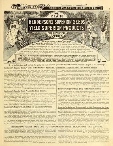 | Keywords: Everything for the garden (16459493138).jpg iSTABLg S <br> WE <br> CLAIM <br> <br> ijj <br> HENDERSONS SUPERIOR SEEDS <br> YIELD SUPERIOR PRODUCTS <br> OUR CUSTOMERS <br> iRIB <br> VN <br> ; fS i a 'ยซยป- <br> grow <br> \ <br> J /i <br> It IS not enough to know that seeds <br> for weed seeds will grow The vital point is <br> What will they produce This is a matter that is too seldom <br> taken into consideration by the average buyer many of whom are more <br> interested in hunting for the lowest in price while progressive farmers and gar- ' ' ttW- <br> deners appreciate that blood will tell in seeds as well as in animals and reahzmg that - <br> their profits for a whole year depend upon the seeds they plant they avoid cheap seeds as <br> being poor economy knowing that superior seeds produce superior and more profitable crop <br> ยซIP <br> While we do not wish to appear egotistical yet in justice to ourselves and our seeds and for the <br> benefit of people who have never dealt with us we claim to be the producers and distributers of the <br> BEST SEEDS IN THE WORLD it is our business and our profession We know that planters of seeds <br> buy them entirely on confidence ; we realize that to lose a man's confidence is to lose his patronage If <br> you have never used bur seeds TRY THEM THIS YEAR and we will try and retain your confidence <br> as we have succeeded in doing with annually-increasing thousands for over half a century <br> If you had tte time and we had the space we could entertain you with thousands of letters of similar purport to the following <br> tienderson's Superior Seeds Direct to the Planter Appreciated ; tienderson's Superior Seeds Yield Superior Crops ; <br> ข'/ think your ' Xew Departure' is a good one and will receive its reward <br> It is 21 years since I purchased my Srst ข Henderson's Seeds ' and I have yet <br> to find one seed or plant that has failed to fulfill the utmost expectations <br> when purchased from you direct but I have several times purchased <br> seeds elsewhere labeled 'Henderson's so and so ' and found them inferior <br> leaving me to lament too late that I had been foolish enough to allow myselt <br> to ' fall among thieves' for the sake of saving a little time Heartily wishing <br> you success J G Bbittain West Arlin on Baltimore Md <br> You state you will henceforth deal direct with planters I think this will <br> meet with general approval Your seeds are the truest to name of any and I <br> have bought from a good many seedsmen R L Nash Palmetto Fla <br> ข' We can get seeds nearer home but quality in garden seeds is of more <br> importance Unquestionably your seeds are the surest and safest We have <br> never planted a seed from Henderson that refused to grow <br> QuAREY Gardens Leesville Cross Roads Ohio <br> tienderson's Superior Seeds Produce tiie Frize-Winners <br> ' 4m pleased with your seeds I liave taken first premiumson best collections <br> of vegetables raised by gardeners here for the last five years 1 also took <br> many separate premiums on specimens such as your Succession Cabbage <br> etc C Pflhgixg Terre Haute Ind <br> / have much pleasure in telling you that I have won eight prizes at the <br> Horticultural Show here for vegetables and flowers grown from your seeds <br> J M Hetsox Harbor Commissioner's Office Montreal Can <br> / get more prizes on vegetables raised from your seeds than from those <br> of any other seedsmen Misa Id J Sweet West Broome Prov Quebec <br> ข Henderson's Superior Seeds Retain our Customers for Decades ; <br> Seeds and plants give entire satisfaction I believe myself to be one of <br> the oldest customers of your firm / was a student in \ew York during the years <br> 1S49- T0 returning home I purchased at your store and have dealt with you ever <br> since Dr Geo T Bingay Westport N S <br> 7 have dealt now with your firm for over 30 years and J safely assert <br> that after trying various other seedsmen during that period I have always <br> returned to Peter Henderson Co as the most reliable firm in its dealings <br> John F Wielandy Santa Fe New Mexico <br> It is about 40 years since we first ordered seeds from Peter Henderson <br> Co and we have ordered more or less all this time from the establishment with <br> general satisfaction Never had reason to complain <br> A M Engle Moonliglit Kans <br> / used vour seeds along with others in the spring and can truthfully <br> say that Henderson's Seeds yielded more than twice the crop of any other <br> Wm Kelly Paterson N J <br> 7 have used many different growers' seeds but yours excel all others in <br> yielding capacity Edwin Inman South Araboy N J <br> I was prevented from sending my usual order to you last spring but the <br> results from seeds obtained elsewhere were so distinctly inferior to what I have <br> been accustomed to secure with your seeds that I return to vou <br> L W Chaney Nortlifleld Minn <br> People here are enraptured with the qualit v of vegetables produced from <br> your seeds they are the acme of perfection all true to types and would serve <br> as models for your catalogue pictures This is no praise but facts <br> C H Roy Jellico Tenn <br> tlenderson's Superior Seeds Bring Fortli Press Comments <br> We take pleasure in noting the beautiful catalogue 'Everything for the <br> Garden ' from the old and trustworthy house of Peter Henderson C- Co The <br> sterling worth of the firm's goods is too well known to require amplifica- <br> tion Extract fro m Rural New Yorker <br> Henderson's Catalogue is on our table This publication represents one <br> of the oldest seed hou ses in America and one that does an immense business <br> The name of Peter Henderson ยฃ Co is a household word wherever Sowers and <br> vegetables are grown and gardens planted Kansas City Star <br> The house of Peter Henderson Co has long since established a name <br> for the reliable quality and purity of the large quantities of 