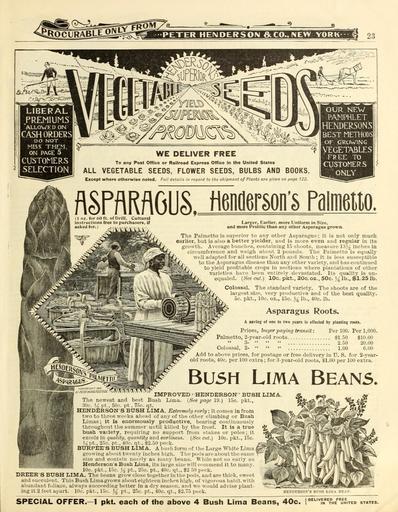 | Keywords: Everything for the garden (16621170006).jpg ˘PETER HENDERSON 6tC0 NEW YORK- <br> 23 <br> » ® <br> LIBERAL <br> PREMIUMS <br> ALLOWED ON <br> CASH ORDERS <br> DO NOT <br> MISS THEM <br> ON PAGE 5 <br> CUSTOMERS <br> SELECTION <br> WE DELIVER FREE <br> To any Post Office or Railroad Express Office in ihe United States <br> ALL VEGETABLE SEEDS FLOWER SEEDS BULBS AND BOOKS <br> Except where otherwise noted Full details in regard to the shipment of Plants are given on page 122 <br> 1 oz for 60 ft of Drill Cultural <br> instructions free to purchasers if <br> asl ed for j <br> OUR NEW <br> PAMPHLET <br> HENDERSONS <br> BEST METHODS <br> OF GROWING <br> VEGETABLES <br> FPEE TO <br> CUSTOMERS <br> ONLY <br> tienoerson's Palmetto <br> Larger Earlier more Uniform in Size <br> and more Prolific than any other Asparagus grown <br> The Palmetto is superior to any other Asparagus; it is not only much <br> earlier but is also a better yielder and is more even and regular in its <br> growth Average bunches containing 15 shoots measure 13 inches in <br> circumference and weigh about 2 pounds The Palmetto is equally <br> well adapted for all sections North and South ; it is less susceptible <br> to the Asparagus disease than any other variety and has continued <br> to yield profitable crops in sections where plantations of other <br> varieties have been entirely devastated Its quality is un- <br> equaled See cut 10c pkt 20c oz 50c i lb 1 25 lb <br> Colossal The standard variety The shoots are of the <br> largest size very productive and of the best quality <br> 5c pkt 10c oz 15c 34 lb 40c lb <br> Asparagus Roots <br> A saving of one to two years is effected by planting roots <br> Prices buyer paying transit Per 100 Per 1 000 <br> Palmetto ˘2-year-old roots 1 50 10 00 <br> 3- 2 50 20 00 <br> Colossal 2- ' 1 00 6 00 <br> Add to above prices for postage or free delivery in U S for 2-year- <br> old roots 40o per 100 extra ; for 3-year-old roots Sl OO per 100 extra <br> BU5H Lima Bean5 <br> ˘ vVvV V V l' <br> IMPROVED ' HENDERSON BUSH LIMA <br> The newest and best Bush Lima See page 19 15c pkt <br> 30c K Pt- 50c pt 75c qt <br> HENDfiRSON'S BUSH LIMA Extremely early ; it comes in from <br> two to three weeks ahead of any of the other climbing or Bush <br> Limas; it is enormously productive bearing continuously <br> throughout the summer until killed by the frost It is a true <br> bush variety requiring no support from stakes or poles ; it <br> excels in quality quantity and earliness See cut 10c pkt 15c <br> i pt 25c pt 40c qt S2 50 peck <br> BURPEE'S BUSH LIMA A bush form of the Large Wliite Lima <br> growing about twenty inches high The pods are about the same <br> size and contain ne;irly as many beans Vhilenotso early as <br> Henderson's Bush Lima its large size will commend it to many <br> 10c pkt 15c 1 pt 25c pt 40c qt 2 50 peck <br> CREER'S BUSH LIMA The beans grow close together in the pods and are thick sweet <br> and succulent This BushLimagrows about eighteen inches high of vigorous habit with <br> abundant foliage always succeeding better in a dry season and we would advise plant- <br> ing it 2 feet apart 10c pkt 15c pt 25c pt 40c qt 2 75 peck <br> HENPERS0N8 BTSH LIMA BEAN <br> SPECIAL OFFER ” 1 pkt each off the above 4 Bush Lima Beans 40c <br> ; DELIVERED FREE <br> IN THE UNITED STATES 42383140 133997 66553 Page 23 Text http //www biodiversitylibrary org/page/42383140 1902 10 5962/bhl title 66553 Henry G Gilbert Nursery and Seed Trade Catalog Collection ; Peter Henderson Co NameFound Asparagus NameConfirmed Asparagus var pygmaeus Makino EOLID 10487111 NameFound Limas NameConfirmed Limas NameBankID 4220815 Biodiversity Heritage Library Everything for the garden 1901 Garden Stories Catalogs Flowers Peter Henderson Co Plants Ornamental Seed industry and trade Seeds Trade catalogs Vegetables U S Department of Agriculture National Agricultural Library bhl page 42383140 dc identifier http //biodiversitylibrary org/page/42383140 BHLinbloom bhlGardenStories peter henderson co plants ornamental u s department of agriculture national agricultural library bhlinbloom bhlgardenstories Information field Flickr posted date ISOdate 2015-02-25 Check categories 2015 August 24 CC-BY-2 0 BioDivLibrary https //flickr com/photos/61021753 N02/16621170006 2015-08-24 22 52 15 cc-by-2 0 PD-old-70-1923 Everything for the garden 1902 Photos uploaded from Flickr by Fæ using a script |