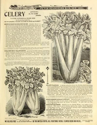 | Keywords: Everything for the garden (16828250546).jpg CELERY <br> CONTINUED <br> oz for 2 000 <br> plants <br> To EVERY CUSTOMER for CELERY SEED <br> we will send free if asked for <br> oar new pamphlet CELERY CULTURE for HOME and MARKET <br> HENDERSON'S GOLDEN ROSE Golden Eose is a _ <br> development of the favorite Golden Self-blanching and <br> shows its parentage in its strong habit of growth while p <br> its self-blanching character is strongly fixed The plant - <br> is dwarf and heavy the stalks are very broad and solid <br> and are also entirely free from those objectionable <br> ridges which generally accompany stringiness ; indeed <br> there is so little string that the stalks are positively <br> brittle The general color is about identical with Gold- <br> en Self-blanching except that the naturally golden- <br> colored stalks are suffused with a warm rosy hue <br> which gradually fades towards the top of the stalks <br> where it assumes a bright golden color when properly <br> blanched and fit for the table The unique combination <br> of color makes it exquisitely beautiful in appearance and its self- <br> blanching habit assures its earliness while its hardiness and solidity <br> bespeak its ability to keep for a considerable time See cut 10c <br> pkt 40c oz 1 251 lb <br> ˘ I raised quite a little of rovr Golden Rose Celery this year and must say that <br> it is everything you claim GEORGE BRADFORD Kalamazoo Micb <br> GOLDEN SELF-BLANCHING A most valuable variety partaking <br> of the character of the celebrated White Plume inasmuch as it simply <br> needs a slight earthing up or handling It is of a beautiful waxy <br> golden color very solid and of a rich nutty flavor 10c pkt 50c <br> oz 1 75 1 lb S6 00 lb <br> ' ˘ The seed that I received from you this sprinp was very satisfactory; and I was <br> very much pleased with the Golden Self-blanching Celery It grew the purest and <br> handsomest Celery I ever saw and I would like some more of the same seed <br> THOM iS n'pOD Swansea Mass <br> ' I hope the Golden Self-blanching Celery will be as good astheVt lb bought from <br> von last spring I set T 200 plants and each niadea head and each was self-blanching <br> You never sa w a prettier picture 7 200 Golden Self-blanching on a plot S2 by 38 feet <br> March 20 1S99 G L JOHNSOy 128 W Oneida St Oswego N T <br> GIANT PASCAL CELEBY <br> GIANT PASCAL A green selection from the Golden Self-blanching <br> Celery partaking of the best qualities of that variety but is much larger <br> and a better keeper It is of a fine nutty flavor being entirely free from <br> any bitter taste It grows two feet high ; stalks broad thick crisp <br> and stringless ; the width and thickness of the stalks are distinctive <br> features of this variety It bleaches with but slight earthing up <br> and very quickly A valuable variety for both second early and mid- <br> winter use See cut 10c pkt 30c oz 80e 1-4 lb 2 50 lb <br> Tour Giant Pascal Celery took the town or rather the town took the Celery <br> It was considered the besfin our market large solid white and crisp <br> C \L VIS S UITH Market Gardener Xorwalk Ct <br> HENDERSON'S HALF D'WARF Entirely solid possessing a rich <br> nutty flavor while it has much vigor of growth surpassing most of <br> the large-growing sorts in weight of bunch 5c pkt 25c oz 75c <br> 1 lb 2 50 1b <br> BOSTON MARKET Similar to the Dwarf White but rather more <br> robust The leaves are a darker green the stalks when blanched <br> being nearly white It is an excellent variety solid crisp and tender <br> 5c pkt 25c oz 75c X4 lb 2 50 lb <br> GIANT WHITE SOLID A large-growing sort attaining a height <br> under good cultivation of 3 feet This variety is most suitable for <br> southern sections of the country as it grows freely in hot or dry at- <br> mosphere 5c pkt 20c oz 60c I4 lb 2 00 lb <br> HENDERSON'S DWARF WHITE This variety is perfectly solid <br> the stalks half-round When blanched is a yellowish white crisp <br> tender and of fine flavor 5c pkt 25c oz 75c 3 lb 2 50 lb <br> WEDELIYEEFHEE <br> f TO AXT P O OR 1 <br> i B K EXPRESS OFFICE i <br> IK THE UNITED STATES 9LL VEGETABLE SEEDS FLOWER SEEDS AND BDLBS <br> I EXCEPT WTIERE <br> \ XOTED 42383126 133997 66553 Page 37 Text http //www biodiversitylibrary org/page/42383126 1902 10 5962/bhl title 66553 Henry G Gilbert Nursery and Seed Trade Catalog Collection ; Peter Henderson Co Biodiversity Heritage Library Everything for the garden 1901 Garden Stories Catalogs Peter Henderson Co Plants Ornamental Seed industry and trade Seeds Trade catalogs Vegetables U S Department of Agriculture National Agricultural Library bhl page 42383126 dc identifier http //biodiversitylibrary org/page/42383126 bhlGardenStories Celery BHLinbloom peter henderson co plants ornamental u s department of agriculture national agricultural library bhlgardenstories bhlinbloom Information field Flickr posted date ISOdate 2015-03-18 Check categories 2015 August 24 CC-BY-2 0 BioDivLibrary https //flickr com/photos/61021753 N02/16828250546 2015-08-24 20 54 58 cc-by-2 0 PD-old-70-1923 Celery Everything for the garden 1902 Photos uploaded from Flickr by FĂŚ using a script |