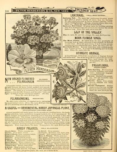 | Keywords: Everything for the garden (16853142562).jpg LflNTflNftS <br> TKUL KND OSB nFZR <br> Lantanas Tall We have few continuous-blooming plants <br> that afiford a greater variety of colors than the Lantana <br> We oflfer a fine collection of twelve distinct varieties includ- <br> ing the irm'h'nsr Lantana Orange crimson yellow lilac rose <br> white etc Price 10c each set of 12 for 1 00 <br> Lantanas New Dwarf Of great value for bedding growing <br> only 10 to 12 inches high and covered with flowers the whole <br> summer long Price 15c each set of 4 for 50c <br> LILY OF THE YflLLEY <br> Pips 5c each 50c per doz ; clumps 50c each 4 50 per doz <br> MOON FLOWER VINES <br> The Moon Flower So called from its rare peculiarity of <br> blooming best at night although it also expands its flowers <br> on dull days They are pure white 5 to 6 inches across <br> emitting a rich Jessamine-lilie odor Price 15c each 4 for 50c <br> Blue Dawn Flower Intense violet-blue with reddish purple <br> rays 6 inches across It blooms in the morning and on cloudy <br> days Price 15c each 4 for 50c <br> OTflttEITE ORANGE <br> A beautiful variety bearing large trusses of rich laven- <br> der-pink flowers the lower petals marked rich maroon <br> The coloring is almost identical with the orchid Cattleya <br> triannffi The plant is a remarkably free and vigorous <br> grower a vei-y prolific bloomer and the color taljes on <br> sight so that it will be valuable for market See cut <br> Price 30c each 3 00 per doz <br> A dwarf Orange which bears a profusion of fragrant flowers <br> and edible fruit One of the most effective plants for the house <br> Price large plants 50c each <br> Young plants 15c each 1 50 <br> per doz <br> PflSSIFLORflS <br> PASSION FLOWER <br> John Spalding Flowers 3 to 4 <br> inches in diameter pure ivory <br> wliite ; deliciously fragrant <br> variegated foliage <br> Cerulea Similar to the preced- <br> ing but has beautiful blue <br> flowers See cut <br> Pfordtii Large deep purple <br> flowers carmine and white <br> in centre <br> Pfordtii Variegated Similar <br> to above in every way but has <br> foliage mottled golden-yeUow <br> Price 10c each 1 00 per doz <br> PELftRGONIUMS <br> KSSORTBD <br> PA8SIFLOBA CEBULEA <br> We offer a nice collection of standard sorts embracing <br> the most distinct colors Price 30c each 3 00 per doz <br> set of 6 including Alfred Henderson 1 50 <br> ft USEFUL «« ORNflMENTftE tiflRDY JftP/lNESE PLANT <br> OPHIOPOGON JKBURKN 5ZKR <br> A most beautiful and useful plant for the greenhouse dwelling house the hardy <br> garden collection vases jardinieres hanging baskets etc it is unsurpassed It <br> stands changes of temperature admirably and is what may be called A hot and <br> GOLD BOOM PLANT The foliage is gracefully curved broad grass-like and hand- <br> somely and evenly striped creamy wliite on a deep green surface It bears numer- <br> ous upright dense spikes of violet-blue flowers about a foot in length Tlie flow- <br> ers are followed by blue berries about the size of currants which remain along <br> time in 7 - rfection forming a charming contrast This is the best hardy border plant <br> imaginable Price large plants 75c each Young plants 30c each 3 00 per doz <br> liflRDY PHLOXES <br> Claude Gelee White carmine eye <br> Czarina Pure white dwarf <br> Cross of Honor Lilac margined white <br> Dominican Dark purplish red <br> Durandal Deep reddish purple <br> Eclaireur Keddish carmine dark eye <br> E Chatrain Blush white carmine eye <br> Harry Menier White crimson eye <br> Hercules Early Ricli heliotrope-pink <br> Jeanne d'Arc Dwarf clear white <br> L'Avenir Rosy carmine red eye <br> La Nuit Purplish maroon very dark <br> Price pot-grown plants 15c <br> r KL L BI-OOJOSING <br> La Soleil Deep carmine <br> La Vogue Beautiful soft light pink <br> Lothair Soft carmine-jnnk rosy eye <br> Mme C Nillson White pink eye <br> Mrs Laing Light purple carmine eye <br> Mrs Miller Early Deep lavender-pink <br> Marie Belanger Carmine dark eye <br> Placide B lit carmine-pink dark eye <br> Richard Wallace Wliite carmine eye <br> Sir Edwin Landseer Brilliant carmine <br> WHITE LADY Pure white See cut <br> Wxn Robinson Salmon-pink rosy eye <br> each set of 24 for 2 50 <br> HARDY PHLOX WHITE LADY 42383255 133997 66553 Page 166 Text http //www biodiversitylibrary org/page/42383255 1902 10 5962/bhl title 66553 Henry G Gilbert Nursery and Seed Trade Catalog Collection ; Peter Henderson Co NameFound Cattleya NameConfirmed Cattleya EOLID 11350393 NameBankID 2663173 NameFound Lantana NameConfirmed Lantana L EOLID 37682 NameBankID 459108 NameFound Lilac NameConfirmed Lilac P Miller 1754 NameFound Ophiopogon NameConfirmed Ophiopogon Ker-Gawl EOLID 30130 NameFound Phlox NameConfirmed Phlox L EOLID 40661 Biodiversity Heritage Library Everything for the garden 1901 Garden Stories Catalogs Flowers Peter Henderson Co Plants Ornamental Seed industry and trade Seeds Trade catalogs Vegetables U S Department of Agriculture National Agricultural Library bhl page 42383255 dc identifier http //biodiversitylibrary org/page/42383255 bhlGardenStories Pelargoniums Passiflora Phlox BHLinbloom peter henderson co plants ornamental u s department of agriculture national agricultural library bhlgardenstories bhlinbloom Information field Flickr posted date ISOdate 2015-03-18 Check categories 2015 August 24 CC-BY-2 0 BioDivLibrary https //flickr com/photos/61021753 N02/16853142562 2015-08-24 20 55 42 cc-by-2 0 PD-old-70-1923 Passiflora Phlox Everything for the garden 1902 Photos uploaded from Flickr by Fæ using a script |
