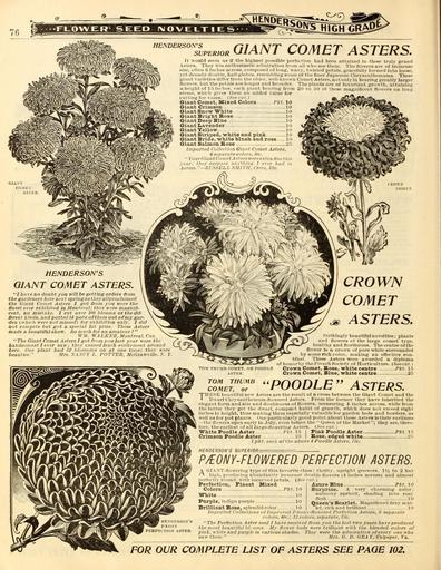 | Keywords: Everything for the garden (16854133015).jpg že „¢Â«so s qjj j comet asters <br> It -would seem as if the highest possible perfeition had been attained in these truly grand <br> Asters They win enthusiastic admiration fnmi all who see them The liowers are ol immense <br> size often 6 inches across composed of long wavy twisted petals gracefully formed into loose <br> yet densely douhle halt-globes resembling some of the finer Japanese Chrysjuithemums These <br> 'ill\ UWf giant varieties differ from the older well-known Comet Asters notouly in bearing greatly larger <br> iMaW lowers but the petals are longer and broader The plants are of luxuriant growth attaining <br> aliiijihtofl T inches each plant bearing from 20 to 30 of these magnilicent flowers ou long <br> Ktinis wliich gives them an added value for <br> cutting for vases iSpeciil <br> ifn Giant Comet Blized Colors Pkt 10 <br> il w» Giant Crimson 10 <br> 1 K\Vm© Giant Snow White 10 JSaitira g\ <br> 'i vjEE'tM Giant Bright Bose 10 fiOBBvv ' <br> Giant Deep Bine 10 3BSS r <br> Giant Lavender 10 B m -' <br> Giant Yellow lo B fflgkfer <br> Giant Striped -white and pink 10 ~ <br> r/rir«i Mlf Giant Bride white blush and rose 10 SM j sS - j ' ' Zy S JiP <br> V- » Giant Salmon Hose 2 'jBPS E 'g ' l k <br> jf S i Imported Cullfriion Giant Comet Asters <br> 7iK 3 sepunite colors ij /c <br> y jVi'5V J' N YourGmntCometAsterswereextratlnethis BT HITVilf f 'V lll 'Ki illi1lT' l <br> Ti'mrri'-' \vX rc/jr; f/iei' s«r/j i s s aiiytliiiin I ever lind in <br> i'M'lMylM Asters ” RLSHELL SMITH Crrtr Ills tLromn i L~Mlim ITil IT ¢ T-ll <br> HENDERSON'S <br> GIANT COMET ASTERS <br> I bn ve no doubt yon vill be getting orders fi-om <br> the gardeners lure next spring nstbeyallproclaiined <br> tbe Giant Comet Asters I got O-om you were the <br> Snest ever exhibited in Montreal they Mere niagnitl- <br> – cent no mistake I cut over 100 blooms at the dif- <br> ferent kinds and potted 14 pots otthem out of my gar- <br> – den nliifh were not missed for exbiliition only I did <br> not compete but got a special 1st prize These Asters <br> made a beautifiil show So much for au amateur I <br> ir l/ WALKKIt Montreal Can <br> The Giant Comet A sters I got from you last year were the <br> tandsomest I ever saw; they caused much excitement around <br> here One plant bad 52 blo ssonis on at one time; tbe y were <br> beauties Mrs \A\CY L POTTER McGrawville N Y <br> CROWN <br> COMET <br> ASTERS <br> TOM THfMB rOMET OR POODLE <br> ASTEIl <br> Strikingly beautiful novelties; plants <br> and liowers of the large comet tyi e <br> healthy and floriferous The centre of the <br> flower is a crown of pure white surrounded <br> by some rich color making an effective con- <br> trast These Asters were awarded a diploma <br> of lionorliy the French Sricli-ty of Horticulture Seecut <br> Crown Comet Bose -white centre Pkt 15 <br> Cro-wn Comet Bine white centre 25 <br> TOM THUMB <br> COMET or <br> POODLE Asters <br> THKSF; beautiful new Asters are the result of across between the Giant Comet and the <br> Dwarf Chr vsanthemuni-flowered Asters From the former tlie v have inherited the <br> elegant form and size and doubleness of flowers meusuri/ig 4 inches across wlille from <br> the latter they get the dwarf compact habit of growth which does not exceed eight <br> inches In height tlius making them espectall v valuable for garden be l8 and borders as <br> well as for pot plants One particularly good point about thesis Asters Istheir earllness <br> ” the liowers open early in July even before the icieen of the Market ; they are there- <br> fore the earliest of all large-tloweriiig Astci-s Si-r rut i <br> White Poodle Aster Pkt 1 5 I Pink Poodle Aster Pkt l <br> Crimson Foodie Aster '2o \ Bose edg-ed white 2 <br> 1 pkt each of the above 4 Poodle Astc-r 'i TJc <br> HENDERSON'S SUPERIOR - <br> P/EONY-FLOWERED PERFECTION ASTERS <br> A GI \NT-flowering type f f this favorite class; thrifty nprigiit growers IV2 to 2 feet <br> hif;h pi'ddnciiig ahnndantly immense double flowers 4 inches across and almost <br> Iicrffitly round witli incurved i etals See cut <br> Perfection Finest Mixed <br> Colors Pkt 10 <br> White 10 <br> Purple indigo purple 10 <br> Brilliant Bose splendid color 1 <br> Azure Blue Pkt 10 <br> Surprise 4 very charming color; <br> salmnnv apricot shading into rosv <br> flesh ' lb <br> Queen's Scarlet Magnificent fiery scar- <br> let rich and brilliant 10 <br> Import ed Collections of Improvrd J' eony-tto\iered Perfection Asters 8 separate <br> colors 4t tc ' 1 1 colors separate 7oc <br> The Perfection Aster seed I ha re received from you the last two years ha re produced <br> the most beautiful bl'oms My flower beds were brilliant with tlie blended colors of <br> pink white and purple in various shades They were the admiration of every one who <br> saw them Mrs G I GIIAY Culpeper Va <br> FOR OUR COMPLETE LIST OF ASTERS SEE PAGE 102 <br> N'DERSON'S <br> EO SY <br> PEEPECTION A8TEB 42383117 133997 66553 Page 76 Text http //www biodiversitylibrary org/page/42383117 1902 10 5962/bhl title 66553 Henry G Gilbert Nursery and Seed Trade Catalog Collection ; Peter Henderson Co Biodiversity Heritage Library Everything for the garden 1901 Garden Stories Catalogs Flowers Peter Henderson Co Plants Ornamental Seed industry and trade Seeds Trade catalogs U S Department of Agriculture National Agricultural Library bhl page 42383117 dc identifier http //biodiversitylibrary org/page/42383117 bhlGardenStories Asters BHLinbloom peter henderson co plants ornamental u s department of agriculture national agricultural library bhlgardenstories bhlinbloom Information field Flickr posted date ISOdate 2015-03-18 Check categories 2015 August 24 CC-BY-2 0 BioDivLibrary https //flickr com/photos/61021753 N02/16854133015 2015-08-24 20 54 50 cc-by-2 0 PD-old-70-1923 Everything for the garden 1902 Photos uploaded from Flickr by Fæ using a script |
