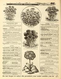 | Keywords: Everything for the garden (16854182975).jpg POMPON CROWN ASTER <br> ARISTOLOCHIA SIPHO <br> DVTCH MAN 8 PIPE VINE <br> Rapid luxuriant hariiy perennial cUmberj large <br> leaves making dense shade; flowers vellow and Drown <br> mottled and curiously shaped 30 feet Pkt 10 <br> ARNEBIA« <br> CORNTTTA A ohnrniing bushy annual about 2 <br> feet high It blooms the whole summer Flowers <br> of rich yellow with black spots changing to maroon <br> and on the third day vanish leaving the flower a <br> clear bright yellow I'kt 10 <br> ORNAMENTAL ASPARAGUS <br> Broussoneti Beautiful hardy perennial climber <br> growing 10 feet high; feathery foliage and scarlet <br> berries; ver v ornamental in the autumn Pkr 10 <br> Fltunosiis nanus A greenhouse perennial climber <br> with e x iuisite feathery lace-like foliage; extensively <br> grown by florists for cutting purposes 25 <br> Spreng'eri Emerald Fentlwr A most lively <br> trailer; invaluable as a pot plant for baskets or <br> vases The numerous fronds are frecjuently 4 teet <br> long well dressed with leaves of rich green retain- <br> ing their freshness for weeks when cut; white flowers <br> followed by red berries A fine house plant as it <br> withstands dry ntinosiiliere 10 <br> ASPERULA ODORATA <br> Sweet Woodruff Very pretty dwarf hard v plant <br> much esti'cmed for its delightful odor Flowers <br> white Pkt 5 <br> ASTERS <br> For noveltlMt in AstiTs see pages 7 5 and 77 <br> BAI I -SHAFED or JEWHL ASTEBS Mag- <br> nificent class Konnd biill-8liai ed densely double <br> flowers 9 inches in circumference short incurved <br> petals Plants sturdy -ft MixedColors f Af 10 <br> BAXZi or FIBE ASTEB Brilliant blood- <br> scarlet color; plants of compact pyr imidal habit <br> about 12 inches high ; flowers medium size very <br> double and borne in abundance 10 <br> BETTEBIDGE'S QUII UBD ASTEBS L rge <br> double flowers composed of tube c r luill-ehaped <br> petals surrounded by broad guard petMls 2 feet <br> high a great variety of colors Uized Colors <br> GIAITT SII TEB TIPPED ASTEBS Very <br> large double flowers The tip of each petal being sil- <br> very white; strong branching plants 18 Inches high <br> Bose Pink Tipped Silver 10 <br> Blue Tipped Silver 10 <br> CHBTSAlTTHEanTM-FI OWEBEI DWABF <br> Grow 9 inches high Suri a ss all the dwarf \sters <br> in size of flowers They are full and double and <br> produced in clusters of 20 to 30 on a plant Finest <br> Mixed Colors 10 <br> Snow-white 10 I Fiery Scarlet 10 <br> Flesh Pink 10 Dark Ziavender 10 <br> Crimson 10 I Brilliant Bose 10 <br> Iinjiorted Collection of Dwarf Chryanntliemum- <br> flowered Asters 6 separate varieties 40c ; 12 va- <br> rieties Tiir <br> CHI1TAGI OBE-FI OWEBED ASTEBS Mixed <br> Colors A tall double-flowering class very largely <br> sold but not equal to the imnroved varieties 3 <br> COMET ASTEBS See pa aelC- 10 <br> CBOWW or COCABDEATT The centre of each <br> flower is white surrounded by a broad margin of <br> color such as crimson rose violet etc ; flowers <br> large and freely produced; height 18 inches to 2 <br> feet Mixed Colors 10 <br> Imported Colh'itinn of 6 separate colors 40c <br> DATBBEAK ASTER See page 77 15 <br> DWABF-PYRAMIDAl BOUQUET Pretty <br> class; very profuse producing 20 to 50 heads of <br> bloom; grows 1 foot high Mixed Colors 10 <br> OOLUEN BAUTO SIA <br> DWARF CHRYSA VTUE MU M-FLOWEBED ASTER <br> Hf <br> JAPA NESE TASKKl ASTER <br> ASTERS ” Continued <br> DAHI IA-FI OWEBED Beautiful and distinct <br> \ plant jiroduces about iiO faultless semi-spherical <br> flowers composed of short thickly set imbricated <br> petals having the appearance of a Lilllput Dahlia <br> Dahlia-flowered Snow Ball pure white Pjtf 10 <br> ” Princess w hite shaded with rose and blush 10 <br> ” Bosalind bright rose 10 <br> ” Mixed Colors 10 <br> JUBILEE ASTERS SVepn e 77 10 <br> JAPANESE TASSEL Immense flowers 5 to <br> Indus icross with long narrow curly petals <br> giving the appearance of disheveled lapanese <br> Chrysanthemums; plants vigorous and free-flower- <br> ing about 15 inches high The colors are flesh <br> I ink white rose crimson lavender and violet <br> which we offer in Mixed Colors 10 <br> LONG-STEMMED UPRIGHT WHITE AS- <br> TER For Cut Flowers A tall variety 30 <br> inches high carrying 20 to 25 large and double <br> jiure white flowers The steins are stiff and strong <br> and from 2o to 24 inches long and in consequence <br> of exceptionnl value for cutting 10 <br> OSTRICH PLUME ASTERS See page 77 10 <br> PERFECTION ASTERS See page 76 10 <br> POMPON CROWN 'Iliese grow compactly about <br> 12 iTiilics hiirh Iii' iring great numbers of densely <br> lonble flowers 2 to 2VL inclies across Each flower <br> has a distinct white centre encircled with some <br> other color Mixed Colors 10 <br> QUEEN OF THE EARLIES The earliest of all <br> \sters Plants dwarf bloom freely; double flowera <br> borne on long stems of value foi' cutting <br> White 10 I Scarlet 10 <br> Indig-o 10 I Mixed Colors 10 <br> RED HUSSAB A new and brilliant glowing scar- <br> let \ster free from the magenta tinge usual in red <br> \sters; the flowers 3 to4 inches acro ss areglobular <br> double to the centre and borne freely on sturdy <br> candelabra-branching plants about 15 Inches higii; <br> an c x cliiiglv effective bedder 10 <br> SEMPLE'S BBANCHING See pa A'e 77 <br> TBIUMPH Beautiful Dwarf Asters 7 to 8 inches <br> high bearing 30 to 40 flowers from 2 4 to 3 inches <br> across of faultless form and exquisite beaut v <br> Mixed Colors 10 <br> VICTORIA ASTERS See page 77 10 <br> VICTORIA NEEDLE Large flowers composed of <br> ietals twisted as rfiund as knitting-needles uni ue <br> and charming Plants about IS im-lies high <br> branching and floriferous Mixed Colors 10 <br> AURICULA <br> Beautiful low-growing early spring-flowering plants <br> fine for borders pot culture etc ; the fragrant flowers <br> of many rich colors are borne in clusters on the top of <br> stalks 4 t