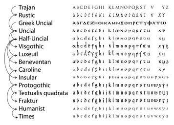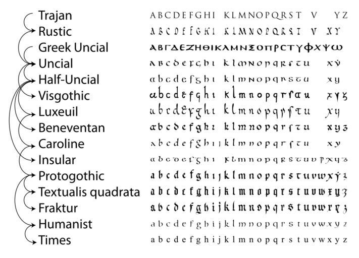 | Keywords: Evolution of minuscule.svg en Evolution of minuscule based on several sources but mainly for convenience from a calligraphy book <ref>David Harris The Calligrapher's Bible 100 Complete Alphabets and How to Draw Them 2003</ref> but corrected the various incorrect forms j v and w removed z and s changed <ref>http //medievalwriting 50megs com/scripts/letters/letters htm letterindex</ref> own Squidonius References Reflist ImageNote 1 291 73 2377 106 2758 1970 2 capitalis monumentalis Roman square capitals as found in the inscriptions on the Trajan Column in Rome also see ImageNoteEnd 1 ImageNote 2 284 308 2364 356 2758 1970 2 Uncial Category Uncial Category Semi-uncial ImageNoteEnd 2 ImageNote 3 291 925 2364 112 2758 1970 2 Beneventan hand ImageNoteEnd 3 ImageNote 4 291 1173 2364 106 2758 1970 2 Insular and Gaelic hands ImageNoteEnd 4 ImageNote 5 291 1045 2334 121 2758 1970 2 Carolingian minuscule developed under the reign of Charlemagne ImageNoteEnd 5 ImageNote 6 284 1418 2351 112 2758 1970 2 Category Textura ImageNoteEnd 6 ImageNote 7 284 1543 2364 125 2758 1970 2 Fraktur Category Fraktur ImageNoteEnd 7 ImageNote 8 287 1293 2344 119 2758 1970 2 Category Gothic minuscule ImageNoteEnd 8 Handwriting Medieval scripts Historical development of letters |