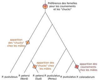 | Keywords: Evolution of songs and female preference of Physalaemus.svg en Evolutive tree of males calls and females preference for this calls in the Physalaemus pustulosus species group From Shaw K 1995 fr Arbre montrant l'évolution des cris mâles et de la préference des femelles pour ces cris chez Physalaemus pustulosus et les espèces proches D'après Shaw K 1995 own Gagea From Kerry Shaw « Phylogenetic tests of the sensory exploitation model of sexual selection » in TREE vol 10 no 3 1995 p 117-120 Physalaemus Phylogenetic trees Sexual selection SVG diagrams in French |