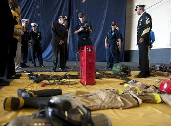 | Keywords: Ex-president Carter visits USS Carl Vinson 130222-N-TZ605-094.jpg en Damage Controlman 3rd Class Milos Sacharzewski shows former President Jimmy Carter a chemical biological radiological mask as part of a damage control static display in the hangar bay of the aircraft carrier USS Carl Vinson Carter former first lady Rosalynn Carter and former Secretary of the Navy John Dalton visited Carl Vinson with more than 200 members of The Carter Center 2013-02-22 CVN 70 https //www dvidshub net/image/875058 130222-N-TZ605-094 2013-02-27 05 06 CORONADO CA US PD-USGov-Military-Navy USS Carl Vinson CVN-70 Images from DoD uploaded by Fæ Jimmy Carter |