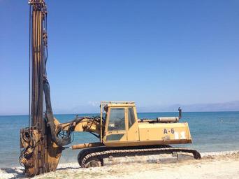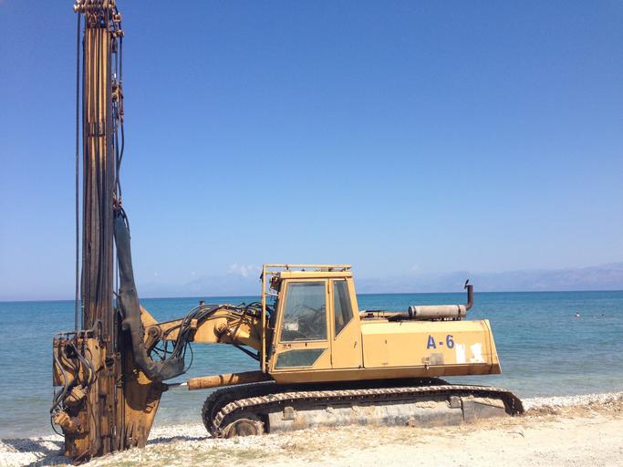 Keywords: excavators construction machine site old construction work tracked vehicle wreck machines tooth of time water stainless rusty ocean beach sea turquoise blue greece beach sea yellow silent quiet