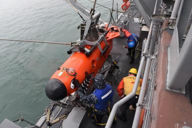 | Keywords: Exercise Foal Eagle 150406-N-AD372-242.jpg en 150406-N-AD372-242 WATERS SOUTH OF THE KOREAN PENINSULA April 6 2015 Sailors aboard the mine countermeasures ship USS Chief MCM 14 recover one of the ships mine neutralization vehicles following execution of mine sweeping training during Exercise Foal Eagle 2015 Chief is currently participating in Exercise Foal Eagle 2015 a series of annual training events that are defense-oriented and designed to increase readiness and maintain stability on the Korean Peninsula while strengthening the Republic of Korea - U S alliance and promoting regional peace and stability in the Indo-Asia-Pacific region U S Navy photo by Mass Communication Specialist 1st Class Abraham Essenmacher/Released 2015-04-06 Petty Officer 2nd Class Abraham Essenmacher https //www dvidshub net/image/1862209 150406-N-AD372-242 2015-04-08 03 04 USS CHIEF WATERS SOUTH OF THE KOREAN PENINSULA AT SEA PD-USGov-Military-Navy USS Chief MCM-14 Images from DoD uploaded by Fæ Foal Eagle 2015 |
