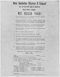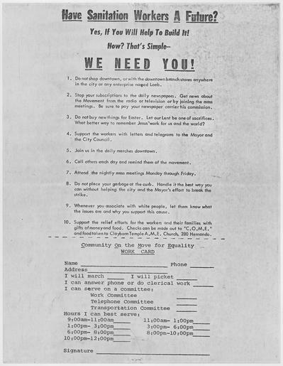 | Keywords: Exhibit 2 in City of Memphis vs. Martin Luther King, Jr - NARA - 279326.tif Scope and content This exhibit is a flyers distributed to the sanitation workers in Memphis Tennessee requesting volunteer assistance and offering instructions for sanitation workers and their sympathizers for the duration of a strike General notes 279326 Local identifier U S District Court for the Western Memphis Division of the Western District of Tennessee 06/20/1878 - NARA's Southeast Region Atlanta NRCA 5780 Jonesboro Road Morrow GA 30260 1968 - 1968 Record group Record Group 21 Records of District Courts of the United States 1685 - 2004 Record group ARC 350 Civil Cases compiled 01/1965 - 12/1975 Series ARC 279322 File unit City of Memphis vs Martin Luther King Jr et al Civil C-68-80 1968 - 1968 File unit ARC 279323 Variant control numbers NAIL Control Number NRCA-21-TWMCVCA2-C68 80 -EXHBT2 yes Other versions NARA-cooperation PD-USGov Civil rights in the United States Martin Luther King Jr Sanitation workers |
