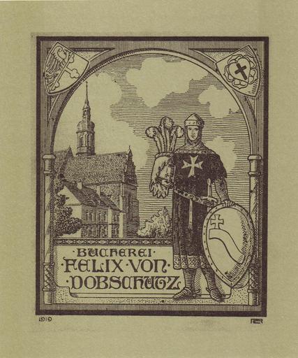 | Keywords: Exlibris-Felix-Dobschütz.jpg Exlibris of Felix von Dobschütz Oppeln Silesia 1919 Es zeigt den Johanniter-Ritter mit dem Dobschütz-Wappenschild und 3 Straußenfedern auf seinem Helm neben der Oppelner Stadtpfarrkirche der langjährigen Wirkungsstätte des Superintendenten Zinkografie in Grün 92 x 79 mm Zeichner Lorenz M Rheude Signum libri decorum 1919 Lorenz M Rheude PD-old Knights in supporters Historical images of Opole Historical images of Holy Trinity Church in Opole Lorenz M Rheude Coats of arms by Lorenz M Rheude Coats of arms of Dobschütz family Coats of arms of Germany to be classified |