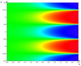 | Keywords: Exponential Function (Real Part) Density.png Diagram of the real part of exponetial function in the complex plane The density is given by <math>z \operatorname Re \left \exp \left x + i y \right \right </math> Blue represents high values red represents low values Please note that the colouring is non-linear it is based on the ArcTan function see the code below and therefore a similar change in hue does NOT necessarily denote a similar change in value Own drawing Plotted in MuPAD 2007-04-20 Inductiveload MuPAD Code <pre> f Re exp x+I y ylimit 2 PI xlimit 3 hsv x y z -> RGB fromHSV 120+85 arctan z 1 1 cplot plot Density f x -xlimit xlimit y -ylimit ylimit Mesh 800 800 AxesTitleFont Courier New Bold 14 TicksLabelFont Arial 10 FillColorFunction hsv YTicksNumber None YTicksAt -3 PI/2 -3 PI/2 -PI -PI -PI/2 -PI/2 -2 PI -2 PI 0 0 PI/2 PI/2 PI PI 3 PI/2 3 PI/2 2 PI 2 PI XTicksDistance 0 5 plot cplot Axes Frame Width 8 5 unit inch Height 7 unit inch </pre> Complex exponential function Hue MuPad diagrams |