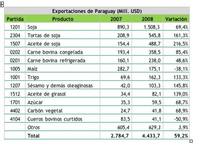| Keywords: Exportparaguay2007-2008.jpg en Paraguay Ministerio de Industria y Comercio / Riedex publicacion graph of increase 2007 - 2008 of the 12 most important export goods Own Paisano flaco Ministerio de Industria y Comercio / Riedex Economy of Paraguay |