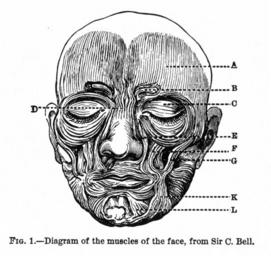 | Keywords: Expression of the Emotions Figure 1.png Figure 1 from Charles Darwin's The Expression of the Emotions in Man and Animals showing human facial muscles see also figure 2 and 3 both by Henle the latter of which has the key Caption reads FIG 1 Diagram of the muscles of the face from Sir C Bell Scanned from 1965 version with foreword by Konrad Lorenz published by University of Chicago Press 1844 This is Plate II from Charles Bell's Anatomy and Philosophy of Expression 1844 third edition See footnote on p 2 of Expressions introduction Public domain PD-old Human faces in art Anatomical plates and drawings of muscles Face and neck muscles The Expression of the Emotions in Man and Animals Plates and drawings of human anatomy from The Anatomy and Philosophy of Expression 6th ed 1872 by Charles Bell 19th-century diagrams Language-neutral diagrams Orbicularis oculi muscles Procerus muscles Nasalis muscles Depressor anguli oris muscles |