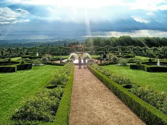Keywords: eyrignac manor gardens dordogne france summer spring trees plants foliage flowers nature outside sky clouds destinations landmark walkway tourists hdr