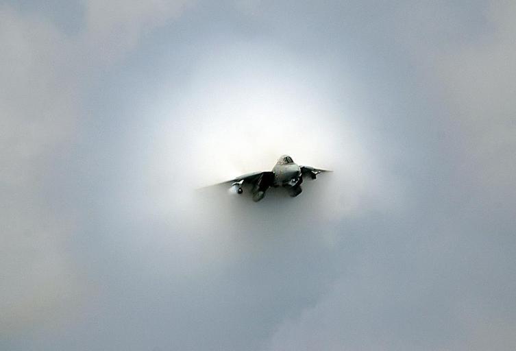 | Keywords: F-14D Tomcat breaking sound barrier.jpg This photo released by the US Navy shows an F-14D Tomcat making a near supersonic fly-by above the flight deck of USS Theodore Roosevelt in a July 28 2006 PD-USGov-Military-Navy F-14D Tomcat with condensation clouds F-14 Tomcat with condensation clouds from shockwaves |