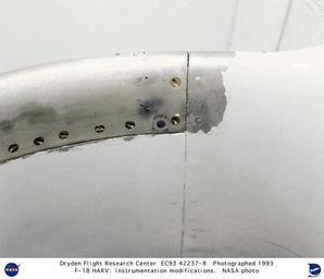 | Keywords: F-18 HARV instrumentation modifications DVIDS708313.jpg en Pressure transducers are located in the tiny holes visible on the engine inlet lip of NASA's F-18 High Alpha Research Vehicle HARV The sensors in this photo are located at the top of the inlet duct entrance and measure pressure distortions during flight The highly modified F-18 airplane flew 383 flights at the Dryden Flight Research Center in Southern California over a nine year period and demonstrated concepts that greatly increase fighter maneuverability Among concepts proven in the aircraft is the use of paddles to direct jet engine exhaust in cases of extreme altitudes where conventional control surfaces lose effectiveness Another concept developed by NASA Langley Research Center is a deployable wing-like surface installed on the nose of the aircraft for increased right and left yaw control on nose-high flight angles NASA Identifier NIX-EC93-42237-8 2009-12-09 Glenn Research Center https //www dvidshub net/image/708313 708313 2012-10-10 16 23 WASHINGTON DC US PD-USGov Langley Research Center Images from DoD uploaded by Fæ |