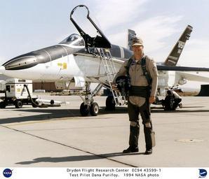| Keywords: F-18 HARV research pilot Dana Purifoy DVIDS716181.jpg en Dana D Purifoy is an aerospace research pilot at NASA's Dryden Flight Research Center Edwards California He joined NASA in August 1994 Purifoy is a former Air Force test pilot who served as a project pilot in the joint NASA/Air Force X-29 Forward Swept Wing research program conducted at Dryden from 1984 to 1991 His most recent assignment in the Air Force was flying U-2 aircraft as a test pilot at Air Force Plant 42 Palmdale CA In addition to flying the X-29 at Dryden as an Air Force pilot Purifoy also served as project pilot and joint test force director with the AFTI F-16 Advanced Fighter Technology Integration/F-16 program also located at Dryden Before his assignments as project pilot on the X-29 and AFTI/F-16 aircraft Purifoy was chief of the Academics Systems Branch at the Air Force Test Pilot School at Edwards Prior to becoming a test pilot he flew F-111 and F-16 aircraft in Great Britain and Germany He has accumulated 3800 hours of flying time in his career The final flight for the F-18 High Alpha Research Vehicle HARV took place at NASA Dryden on May 29 1996 The highly modified F-18 airplane flew 383 flights over a nine year period and demonstrated concepts that greatly increase fighter maneuverability Among concepts proven in the aircraft is the use of paddles to direct jet engine exhaust in cases of extreme altitudes where conventional control surfaces lose effectiveness Another concept developed by NASA Langley Research Center is a deployable wing-like surface installed on the nose of the aircraft for increased right and left yaw control on nose-high flight angles NASA Identifier NIX-EC94-43599-1 2009-09-24 Glenn Research Center https //www dvidshub net/image/716181 716181 2012-10-10 18 02 WASHINGTON DC US PD-USGov Langley Research Center Images from DoD uploaded by Fæ |