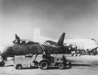 | Keywords: F-86A C-124A Korea 1951.jpeg en A North American F-86A-5-NA Sabre s/n 49-1127 from the 4th Fighter Interceptor Wing at an airfield in Korea probably Suwon in 1951 In the background is a Douglas C-124A Globemaster II s/n 49-256 from the 315th Air Division Combat Cargo <br>Original caption A tiny F-86 Sabre jet of the U S Air Forces 4th Fighter Interceptor Wing in Korea is dwarfed by a giant C-124 Globemaster II which has airlifted a heavy tonnage of priority combat supplies to this Korean airstrip Unity in the overall mission of the U S Far East Air Force is exemplified--FEAF transports of the 315th Air Division Combat Cargo daily airlift vital aircraft parts to keep the fighters operational; the fighters in turn maintain UN air supremacy which protects airfields from hostile aircraft attack http //www defenseimagery mil U S DefenseImagery photo VIRIN http //www defenseimagery mil/imagery html guid ab9cb158f22c8983673f28f4e30e673afc21a131 HF-SN-98-07440 USAF 1951 PD-USGov F-86 Sabres in the Korean War Douglas C-124 Globemaster II 4th Fighter Wing United States Air Force 374th Airlift Wing United States Air Force |