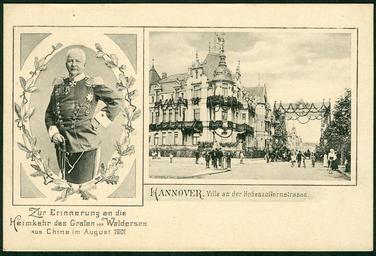 View Original:F._Astholz_jun._AK,_Hannover._Villa_an_der_Hohenzollernstrasse._Zur_Erinnerung_an_die_Heimkehr_des_Grafen_von_Waldersee_aus_China_im_August_1901,_Bildseite_mit_Verlagsangaben_und_Datum.jpg (3331x2268)