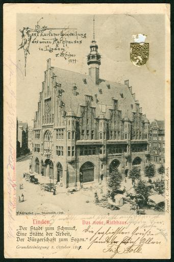 | Keywords: F. Astholz jun. AK 0000 1899 Linden. Das neue Rathaus. Zusgest. Carl Arend, Verlag Hermann Ellermann, Bildseite.jpg Nicht fortlaufend nummerierte im žVerlag von H Ellermann Linden als Lichtdruck und Ansichtskarte reproduzierte Aufnahme des in Hannover tätigen Fotografen Friedrich Astholz junior Unter dem rot gedruckten Titel Zitat Linden Das neue Rathaus findet sich der Spruch Der Stadt zum Schmuck / Eine Stätte der Arbeit / Der Bürgerschaft zum Segen Darunter der Hinweis mit einer handschriftlichen Korrektur auf die Grundsteinlegung 8 October 1897 Während auf dem Vordruck oben links sich mit einer offensichtlich nachträglich handschriftlich aufgebrachten Zierschrift der Hinweis findet auf die Karte zur Einweihung des neuen Rathauses in Linden 5 Oktober 1899 wird unten rechts neben dem Bild auf die Fertigstellung des Gebäudes durch den Lindener Architekten Carl Arend hingewiesen Die Aufnahme zeigt vor dem Neubau ist das Treiben auf dem Lindener Marktplatz während auf der Schauseite des Rathauses zwei mit Pferden angespannte Kutschen auf spätere Dienste warten Oben rechts auf der Karte ist das goldfarben erhabene geprägte Wappen der Stadt Linden vorgedruckt; die leichte Beschädigung machte die Karte für den Sammlermarkt erheblich preisgünstiger Möglicherweise handelt es sich bei der nicht nummerierten Ansichtskarte und im Verlag der Buchhandlung Hermann Ellermann erschienenen Karte um eine der frühesten bekannten Ansichtskarten aus dem Werk des Fotografen Friedrich Astholz junior der später mehr als 1000 fortlaufend nummerierte Ansichtskarten vor allem mit Ansichten aus Hannover produzierte Das hier gezeigte Stück wurde von mehreren Personen mit Grüßen versehen an den auf der umseiten Adressseite genannten Joh Hüther in Hildesheim siehe unten Scan vom Original Bernd Schwabe 1899 Friedrich Astholz junior <gallery> F Astholz jun AK 0000 1899 Linden Das neue Rathaus Zusgest Carl Arend Verlag Hermann Ellermann Adressseite Adressseite an Joh Hüther in Hildesheim Tiefe Straße 10j </gallery> Hermann Ellermann Verlag Friedrich Astholz junior Neues Lindener Rathaus Hannover Market-women Horses in Hannover 1899 in Hannover 1899 documents Tiefe Straße Hildesheim Postcards of Germany PD-old |