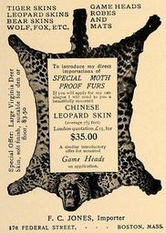 | Keywords: F. C. Jones, Boston, Federal Street, fur skins, advertisement 1906.jpg F C Jones Importer Boston Mass 176 Federal Street fur skins advertisement 1906 Tiger skins leopard skins bear skins wolf fox etc Game heads robes and mats Special offer Large Virginia deer skin soft finish suitable for den and floor 3 50 To intudruce my direct importations of special moth proof furs I will apply for my catalogue I will send you a beautyful mounted Chinese leopard skin average 7 1/2 feet London quotation ‚¤ 15 for 35 00 A Similar introductory offer for mounted Game Heads on application Ebay Periodpaper 1906 author PD-old Fur advertising Jones F C Furriers in Boston Jones F C Leopard fur advertising 1906 advertisements in the United States Fur fashion in 1906 1906 in Boston |