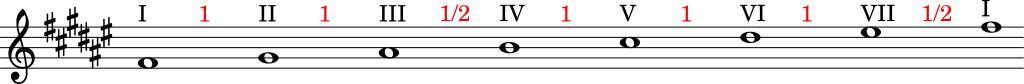 | Keywords: F sharp major scale with degrees and tones.svg en F major scale with degrees and tones fr Gamme de fa majeur avec ses degrés et l'indication des tons 2014-03-01 11 12 35 own Romainbehar LilyPond source <pre> \version 2 16 2 \new Staff \with \remove Time_signature_engraver \set Score defaultBarType empty \clef treble \key fis \major fis'1 \markup I \once \override NoteHead 'transparent t eis \markup \with-color red 1 gis'1 \markup II \once \override NoteHead 'transparent t eis \markup \with-color red 1 ais'1 \markup III \once \override NoteHead 'transparent t eis \markup \with-color red 1/2 b'1 \markup IV \once \override NoteHead 'transparent t eis \markup \with-color red 1 cis1 \markup V \once \override NoteHead 'transparent t eis \markup \with-color red 1 dis1 \markup VI \once \override NoteHead 'transparent t eis \markup \with-color red 1 eis1 \markup VII \once \override NoteHead 'transparent t eis \markup \with-color red 1/2 fis1 \markup I </pre> cc-zero Uploaded with UploadWizard Musical scales GNU LilyPond images |