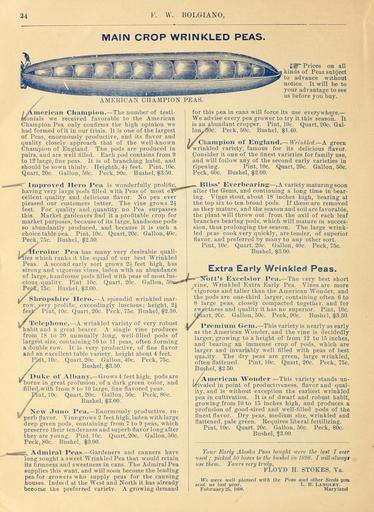 | Keywords: F. W. Bolgiano, seedsmen have won confidence for ten years (16372812462).jpg 24 <br> F W BOLGIANO <br> MAIN CROP WRINKLED PEAS <br> AMERICAN CHAMPION PEA S <br> __ Prices on all <br> kinds of Peas subject <br> to advance without <br> notice It will be to <br> your advantage to see <br> us before you buy <br> I Xniericaii Cliaiiipion The number of testi- <br> IHonials we received favorable to the American <br> Champion Pea only confirms the high opinijon we <br> had formed of it in our trials It is one of the largest <br> of Peas enormously productive and its flavor and <br> quality closely approach that of the well-known <br> Champion of England The pods are produced in <br> pairs and are well tilled Each pod contains from 9 <br> to 12'large fine peas It is of branching habit and <br> should be sown thinly Heighth 4 - feet Pint 10c <br> Quart 20c Gallon 50c Peck 90c Bushel 3 50 <br> T Improved Hero Pea is wonderfully prolific <br> having very large pods filled with Peas of most e5 <br> cellent quality and delicious flavor No pea ever <br> pleased our customers better The vine grows 2 <br> feet For quality and quantity no Pea surpasses <br> this Market gardeners find it a profitable crop for <br> market purposes because of its large handsome pods <br> so abundantly produced and because it is such a <br> choice table pea Pint 10c Quart 20c Gallon 40c <br> Peck 75c Bushel 2 50 <br> Leroine Pea has many very desirable quali- <br> fies which ranks it the equal of our best Wrinkled <br> Peas A second early sort growls 2i feet high has <br> strong and vigorous vines laden with an abundance <br> of large handsome pods filled Avith peas of most lus <br> clous qualitv Pint 10c Quart 20c Gallon 50 <br> Pei 75c Bushel 3 00 <br> Shropsliire Hero A splendid wrinkled mar- <br> row verv prolific exceedingly luscious; height 2i <br> fee Pint 10c Quart 20c Peck 75c Bushel 2 50 <br> f Telephone A wrinkled variety of very robust <br> habit and a great bearer A single vine produces <br> from 18 to 20 unusually long well-tilled pods of <br> large'st size containing 10 to 11 peas often forming <br> a double row It is very productive of fine flavor <br> and an excellent table variety height about 4 feet <br> P nt 10c Quart 20c Gallon 40c Peck 75c <br> Bushel 3 50 <br> Duke of Albany Grows 4 feet high; pods are <br> borne in great profusion of a dark green color and <br> filled with from 8 to 10 large fine flavored peas <br> Pint 10c Quart 20c Gallon 50c Peck 80c <br> / Bushel 3 00 <br> X New Juno Pea Enormously productive su- <br> perb flavor Vine grows 2 feet high laden with large <br> deep green pods containing from 7 to 9 peas which <br> preserve their tenderness and superb flavor long after <br> they are young Pint 10c Quart 20c Gallon 50c <br> Peck 80c Bushel 3 00 <br> ffrrr Admiral Peas Gardeners and canners have <br> long sought a sweet Wrinkled Pea that would retain <br> its firmness and sweetness in cans The Admiral Pea <br> supplies this want and will soon become the leading <br> pea for c rowers who supply peas for the canning <br> houses Indet d at the West and North it has already <br> become the preferred variety A growing demand <br> for this pea in cans will force its use everywhere <br> We advise every pea grower to try it this season It <br> is an abundant cropper Pint 10c Quart 20c Gal- <br> louy Oc Peck 50c Bushel 1 40 <br> //Cha <br> trwrinkl <br> Champion of lE ns\iim\ WH/ikled A green <br> 'wrinkled variety famous for its delicious flavor <br> Consider it one of the finest varieties for family use <br> and will follow any of the second early varieties in <br> ripening Pint 10c Quart 20c Gallon 50c <br> Peck 60c Bushel 2 00 <br> Bliss' Everbearing- A variety maturing soon <br> after the Gems and continuing a long time in bear- <br> ing Vines stout about 18 inches high bearing at <br> the top six to ten broad pods If these are removed <br> as they mature and the season and soil are favorable <br> the plant will throw out' from the axil of each leaf <br> branches bearing pods which will mature m succes- <br> sion thus prolonging the season The large wrink- <br> led peas cook very quickly are tender of superior <br> flavor and preferred by many to any other sort <br> Pint 10c Quart 2 c Gallon 40c Peck 75c <br> Bushel 3 00 <br> Extra Early Wrinkled Peas <br> 'TTott's Excelsior Pea The very best short <br> vine Wrinkled Extra Early Pea Vines are more <br> vigorous and taller than the American Wonder and <br> the pods are one-third larger containing often 6 to <br> 8 large peas closely compacted together and for <br> swjgistness and quality it has no superior Pint 10c <br> 9 art 20c Gallon 50c Peck 90c Bushel 3 50 <br> -/p <br> Premium Gem This variety is nearly as early <br> as the American Wonder and the vine is decidedly <br> larger growing to a height of fjom 12 to 15 inches <br> and bearing an immense crop of pods which are <br> larger and invariably Avell filled with peas of best <br> quality The dry peas are green large wrinkled <br> often flattened Pint 10c Quart 20c Peck 75c <br> Bushel 2 50 <br> I /American Wonder This variety stands un- <br> Irivaled in point of productiveness flavor and qual- <br> ity and is without exception the earliest wrinkled <br> pea in cultivation It is of dwarf and robust habit <br> growing from 10 to 15 inches high and produces a <br> profusion of good-sized and well-filled pods of the <br> finest flavor Dry peas medium size wrinkled and <br> flattened pale green Requires liberal fertilizing <br> Pint 10c Quart 20c Gallon 50c Peck 80c <br> Bushel 3 00 <br> You7' Early Alaska Peaft bought were the best I ever <br> used ; picked 50 boxes to the bushel in 1S98 I will ahcayt <br> use them Yours very truly <br> FLOYD H STOKES Va <br> We were well jAeased with the Peas and other Seeds you <br> sent us last year L li Lanoley <br> February' 5 1898 Maryland 42158382 132780 65933 Page 24 Text http //www biodiversitylibrary org/page/42158382 1899 10 5962/bh