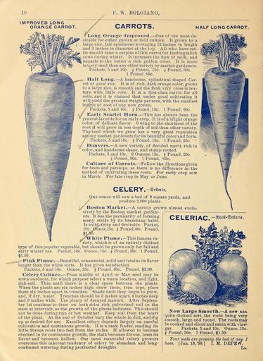| Keywords: F. W. Bolgiano, seedsmen have won confidence for ten years (16186284970).jpg 10 <br> F W BOLGIANO <br> IMPROVED LONG <br> ORANGE CARROT <br> CARROTS <br> HALF LONG CARROT <br> L oiij»- Orange Improved ” One of the most de- <br> sirable for either garden or tield culture It grows to a <br> large size fair specimens averaging 12 inches in length <br> and 3 inches in diameter at the top All who have cat- <br> tle should raise a surplus of this carrot for feedingmilch <br> cows during winter It increases the flow of milk and <br> imparts to the butler a rich golden color It is more <br> la gely used than any other variety by market gardeners <br> Packets 5 and 10c i Pound 15c Pound 30c <br> 1 Pound 0c <br> Half Long ” A handsome cylindrical-shaped Car- <br> rot of good size It is of rich dark orange color grows <br> to a large size is smooth and the flesh very close in tex- <br> ture with little core It is a first-class carrot for all <br> soils and it is claimed that under good cultivation it <br> will yield the greatest weight per acre with the smallest <br> length of root of any now grown <br> Packets 5 and 10c i Pound 15c 1 Pound 60c <br> Early Scarlet Horn ” This has always been the <br> general favorite for an early crop It is of a bright orange <br> color of delicate flavor Owing to the shortness of the <br> root it will grow in less depth of soil than other variety <br> The seed which we grow has a very great reputation <br> among market gardeners for its beautiful color and form <br> Packets 5 and 10c i Pound 15c 1 Pound 55c ' <br> Danvers ” A new variety of decided merit rich in <br> color and handsome shape and stump-rooted <br> Packets 5 and 10c 2 Ounces 15c i Pound 20c <br> i Pound 80c 1 Pound iOc <br> Culture of Carrots ” Follow the directions given <br> for beets and parsnips as there is no difference in the <br> melhod of cultivating these roots For early crop sow <br> in March For late crop in May or June <br> CELERY -©«ii <br> trie <br> One ounce will sow a bed of 9 square yards and <br> produce 2 000 plants <br> Boston Market ” A variety grown almost exclu- <br> sively by the Boston market garden- <br> ers It has the peculiarity of forming <br> many stalks by its branching habit <br> Is solidfCrisp and desirable Packet <br> 10c j nce 15c i Pound 40c Pound <br> liite Plume ” This famous va- <br> riety which is of an entirely distinct <br> type of this popular vegetable but should be grown only for fall and <br> early winter use Packet 10c Ounce 15c i Pound 50c 1 Pound <br> 1 50 <br> cr Pink Plume ” Beautiful ornamental solid and retains its flavor <br> longer than the white sorts It has given satisfaction <br> Packets 5 and 10c Ounce 25c i Pound 65c Pound 2 00 <br> Celery Culture ” From middle of April or May seed may be <br> sown outdoors for which purpose select a warm location and light <br> rich soil Thin until there is a clear space between the plants <br> When the plants are six inches high draw them trim tops place <br> them six inches apart in trenches Shade until they begin to grow <br> and if dry water Trenches should be 3 inches apart 4 inches deep <br> and 9 inches wide Use plenty of decayed manure After Septem- <br> ber 1st continue to draw on both sides rich pulverized soil to the <br> stem at intervals as the growth of the plants indicates This should <br> not be done during rain or hot weather Keep soil from the heart <br> of the plant At the end of October bury the whole in dirt and dig <br> up as desired for use Excellent celery depends largely on careful <br> cultivation and continuous growth It is a rank feeder sending its <br> little fibrous roots two feet from the stalks If allowed to become <br> checked in its continuous growth the stalk becomes fibrous loses its <br> flavor and becomes hollow Our most succet-sful celery growers <br> overcome this inherent tendency of celery by abundant and long- <br> continued watering during protracted droughts <br> CELERIAC - »«'tt-® » « <br> New Large Smooth ” A new an <br> quite distinct sort the roots being very <br> smooth large and round The roots may <br> be cooked and sliced and eaten with vine- <br> gar Packets 5 and 10c Ounce 15c <br> i Pound 50c 1 Pound 1 50 <br> Your seeds are growing the best of any I <br> have Jan 18 '98 I M DEPEW <br> La 42158368 132780 65933 Page 10 Text http //www biodiversitylibrary org/page/42158368 1899 10 5962/bhl title 65933 F W Bolgiano Co ; Henry G Gilbert Nursery and Seed Trade Catalog Collection NameFound L oiij Biodiversity Heritage Library F W Bolgiano seedsmen have won confidence for ten years Garden Stories Bulbs Plants Catalogs Fruit Garden tools Nurseries Horticulture Seeds Vegetables U S Department of Agriculture National Agricultural Library bhl page 42158368 dc identifier http //biodiversitylibrary org/page/42158368 bhlGardenStories BHLinbloom bulbs plants nurseries horticulture u s department of agriculture national agricultural library bhlgardenstories bhlinbloom Information field Flickr posted date ISOdate 2015-01-26 Check categories 2015 August 24 CC-BY-2 0 BioDivLibrary https //flickr com/photos/61021753 N02/16186284970 2015-08-24 07 52 26 cc-by-2 0 PD-old-70-1923 F W Bolgiano seedsmen have won confidence for ten years Photos uploaded from Flickr by Fæ using a script |
