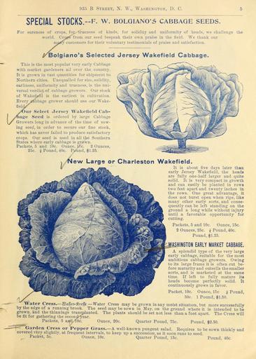 | Keywords: F. W. Bolgiano, seedsmen have won confidence for ten years (16186018868).jpg 935 B Street X W AVashixgtox D C <br> SPECIAL STOCKS -F- w bolqiano's cabbage seeds <br> For sureness of crops fop trueuess of kinds for solidily and uniformity of heads we challenge the <br> world Crops from our seed bespeak their own praise in the field We thank our <br> m iJy customers for their voluntary testimonials of praise and satisfaction <br> Boigiano's Selected Jersey Wakefield Cabbage <br> This is the most popular very early Cabbage <br> with market gardeners ail over the country <br> It is grown in vast quantities for shipment to <br> Northern cities Unequalled for size solidity <br> earliuess uniformity and trueness is the uni- <br> versal verdict of cabbage growers Our stock <br> of Wakefield is the earliest in cultivation <br> Everv jmtbasre srrower should use our Wake- <br> Lr Select Jersey W akefielcl Cab- <br> –şag'e Seed is ordered by large Cabbage <br> Growers long in advance of the time of sow- <br> ing seed in order to secure our fine stock <br> which has never failed to produce satisfactory <br> crops Our seed is used in all the Southern <br> States where early cabbage is grown <br> Packets 5 and 10c Ounce 15c 2 Ounces <br> 25c i Pound 40c Pound 1 25 <br> X ISIew Large or Charleston Wakefield <br> M '9 ifflaift about five davs later than <br> - sv j i Jersey Wakefield the heads <br> are fully one-half larger and quite <br> solid It is very compact in growth <br> and can easily be planted in rows <br> two feet apart and twenty inches in <br> the rows One great advantage it <br> does not burst open when ripe like <br> many other early sorts and conse- <br> quently can be left standing on the <br> ground a long while without injury <br> until a favorable opportunity for <br> cutting <br> Packets 5 and 10c Ounce 15c <br> 2 Ounces 25c i Pound 40c <br> Pound 1 25 <br> ASHINGTON EARLY MARKET CABBAGE <br> A splendid type of the very large <br> early cabbage suitable for the most <br> ambitious cabbage growers Owing <br> to its large frame it'is often cut be- <br> fore maturity and outsells the smaller <br> sorts and is marketed at the same <br> time If left to fully mature its <br> heads become perfectly solid It <br> continuously grows in favor <br> Packet 10c Ounce 15c f Pound <br> 50c 1 Pound 1 50 <br> Water Cress ” JDaiTer- rfffc ”Water Cress may be grown inanv moist situation but more successfully <br> by the edge of a running brook The seed may be sown in Mav on the ground where it is intended to be <br> grown and the thinnings transplanted The plants should be set not less' than a foot apart The Cress will <br> be fit for gathering the second ear <br> Packets 5 ai d/fOc Ounce 20c Quarter Pound 75c Pound 2 50 <br> Garden Cress or Pepper Grass ” A well-known pungent salad Requires to be sown thickly and <br> covered very slightly at frequent intervals to keep up a succession as it soon runs to seed <br> Packet 5c Ounce 10c Quarter Pound 15c Pound 40c 42158363 132780 65933 Page 5 Text http //www biodiversitylibrary org/page/42158363 1899 10 5962/bhl title 65933 F W Bolgiano Co ; Henry G Gilbert Nursery and Seed Trade Catalog Collection Biodiversity Heritage Library F W Bolgiano seedsmen have won confidence for ten years Garden Stories Bulbs Plants Catalogs Fruit Garden tools Nurseries Horticulture Seeds Vegetables U S Department of Agriculture National Agricultural Library bhl page 42158363 dc identifier http //biodiversitylibrary org/page/42158363 bhlGardenStories BHLinbloom bulbs plants nurseries horticulture u s department of agriculture national agricultural library bhlgardenstories bhlinbloom Information field Flickr posted date ISOdate 2015-01-26 Check categories 2015 August 24 CC-BY-2 0 BioDivLibrary https //flickr com/photos/61021753 N02/16186018868 2015-08-24 07 54 21 cc-by-2 0 PD-old-70-1923 F W Bolgiano seedsmen have won confidence for ten years Photos uploaded from Flickr by Fæ using a script |