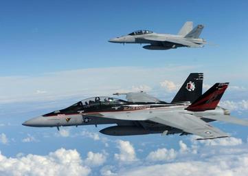 | Keywords: FA-18F VFA-154 CAG bird during RIMPAC 2010.JPG Two U S Navy Boeing F/A-18F Super Hornet aircraft from Strike Fighter Squadron VFA-154 Black Knights prepare to move into formation after receiving fuel from an U S Air Force KC-135R Stratotanker aircraft assigned to the 465th Air Refueling Squadron 507th Air Refueling Wing out of Tinker Air Force Base Oklahoma on 20 July 2010 near Joint Base Pearl Harbor-Hickam Hawaii during the Rim of the Pacific RIMPAC VFA-154 was assigned to Carrier Air Wing 14 CVW-14 aboard the aircraft carrier USS Ronald Reagan CVN-76 The aircraft in front is the personal aircraft of the commander of CVW-14 CAG http //www defenseimagery mil U S DefenseImagery photo VIRIN http //www defenseimagery mil/imagery html guid f9205829dfd4031612d10462b1e8e54a5a970393 100720-F-LX971-258 2010-07-20 U S Air Force photo Tech Sgt Cohen A Young PD-USGov-Military-Navy F/A-18F Super Hornet in flight Strike Fighter Squadron 154 United States Navy United States Navy air group commander aircraft RIMPAC 2010 |