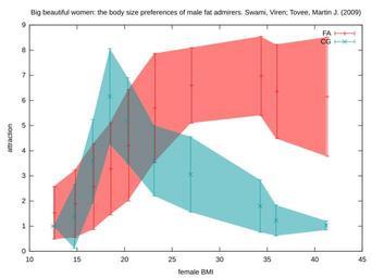 | Keywords: Fa attraction.svg en based on the data from doi 10 1080/00224490802645302 Physical attraction of 47 male fat admirers FA towards 10 female figures from the given BMI range compared with a control group CG set xlabel female BMI set ylabel attraction set title Big beautiful women the body size preferences of male fat admirers FA vs control group CG Swami Viren; Tovee Martin J 2009 set terminal svg size 800 600 set output fa_attraction svg set style fill transparent solid 0 5 noborder fa 0xAA cg 0xFF plot 'fa dat' using 2 3+ 4 3- 4 lc fa with filledcurve notitle \ 'fa dat' using 2 5+ 6 5- 6 lc cg with filledcurve notitle \ 'fa dat' using 2+0 1 3 4 with yerrorbars title FA lc fa \ 'fa dat' using 2 5 6 with yerrorbars title CG lc cg Created with Gnuplot own Mewtu 2011-02-12 Sexuality diagrams Sexual fetishism |