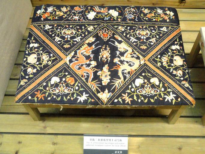 | Keywords: Fabric - Yunnan Nationalities Museum - DSC04144.JPG Yi embroidered horseback cushion Fabric exhibited in the Yunnan Nationalities Museum Kunming Yunnan China I took this photograph 2011-08-13 01 52 00 Daderot Public domain Fabric in the Yunnan Nationalities Museum Yi crafts |