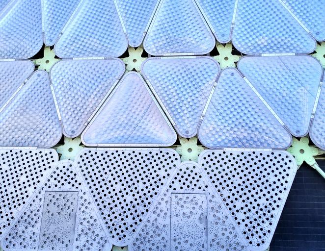 Keywords: facade urban modern architecture singular reflection metal metallized barcelona catalonia sky blue celeste tensioners irons construction architecture structure modern unique architecture metallic polygons design eccentric blue sky light blue white buildings business brightness panels profiles clamping plates star petals doors input door