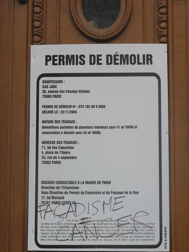 Keywords: Facadisme=Cancer.jpg en Poster of demolition licence tagged with a graffiti against facadism Facadisme cancer on a building with works in progress on the place de l'Opéra Paris 2nd arr fr Affiche de permis de demolir surchargée par un graffiti contre le façadisme Facadisme cancer sur un immeuble en travaux de la place de l'Opéra Paris 2e arr own Tangopaso 2010-05-17 Commons Tangopaso Facadism in France Graffiti in Paris Demonstrations and protests in Île-de-France Boulevard des Capucines Paris Place de l'Opéra Paris Rue du Quatre-Septembre Paris Permits Non-free graffiti |