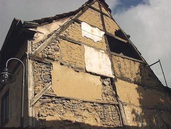| Keywords: Fachwerk-Konstruktion-2004.jpg Fachwerkhaus mit freigelegter Konstruktion mit Gefachen mit Holzgeflecht und Lehmbewurf und Gefachen aus Lehmziegeln in de Bad Langensalza Half-timbered house with exposed timber construction with infill of both wattle and daub and mud brick in Bad Langensalza Germany own 2004-09-30 de Benutzer Sebastian Wallroth Public Domain Sebastian Wallroth Timber framing in Bad Langensalza Half-timbered gables in Thuringia Cob building material Mud walls | ||||
