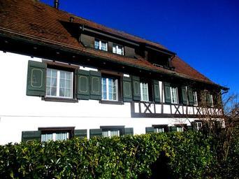 Keywords: fachwerkhaus architecture home truss window shutters towing dormers natural hedge gottlieben thurgau switzerland