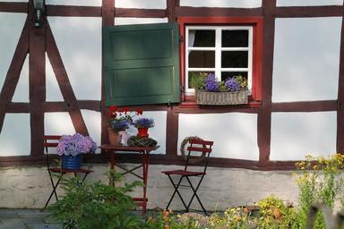 Keywords: fachwerkhaus architecture truss building facade home window historically timber framed building entablature germany still life garden chairs flowers window decorations garden lattice windows deco gartendeko shutter folding chair