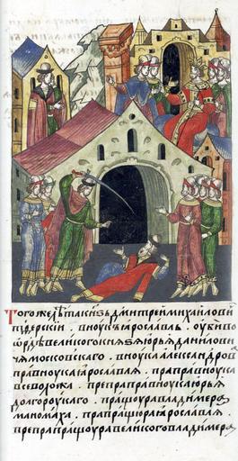 | Keywords: Facial Chronicle - b.07, p.247 - Murder of Yuri of Moscow.jpg Дмит ий ихайлович Г озные Очи убивает Ю ия Даниловича осковского<br /> Того же лета князь Дмит ей ихайлович Тве ской внук Я ославль уби во О де князя Ю ьа Даниловичя осковьскаго В том же году князь Дмит ий ихайлович Тве ской внук Я ославов убил в О де великого князя Ю ия Даниловича осковского внука Александ ова п авнука Я ославова п ап авнука Всеволодова п еп ап авнука Ю ия Долго укого потомка п ащу а Владими а анамаха п ап ащу а Я ослава п еп ап ащу а великого Владими а в Филиппово говение месяца нояб я в 21-й день на п аздник Введениа П ечистыя Бого одици без ца ева слова надеясь на ца ево жалование поскольку ца ь Азбяк чтил князя Дмит ия ихайловича Тве ского И он на то надеясь убил великого князя Ю ия; и не на доб о было это ему самому и был у ца я в опале великой пока не помыслит о нем что сотво ить // Из Ца ственного летописца http //www akteon-elib ru/LITsIeVOI-LIeTOPISNYI-SVOD-Russkaya-letopisnaya-istoriya-Kniga-7/ 222 16th-century anonymous PD-art PD-old Murdered Russian royalty members Yuri of Moscow in miniature Dmitry Mikhailovich 1326 in Russia Facial Chronicle v 6 - Ostermanovskiy 1-y tom 1254-1378 Death in medieval miniatures Russia Oz Beg Khan |
