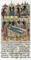 | Keywords: Facial Chronicle - b.07, p.085 - Death of Ivan Dmitrievich of Pereyaslavl.jpg ЛИЦЕВОЙ ЛЕТОПИС ЫЙ СВОД В том же году п еставился князь великий Иван Дмит иевич Пе еславский внук Александ ов п авнук Я ославов п ап авнук Всеволодов п еп ап авнук Ю ия Долго укого потомок п ащу а Владими а анамаха п ап ащу а Всеволода п еп ап ащу а Я ослава Владими овича месяца ма та в 15-й день Детей же не имел и был тих к оток и сми ен и любовен и милостив и к божественным це квам п илежен очень и п емного почитал священнический чин и иноческий и любил их и беседовал с ними неп естанно и к нищим и к ст анникам словно отец был и настолько был доб одетелен что многие дивились житию его http //www akteon-elib ru/LITsIeVOI-LIeTOPISNYI-SVOD-Russkaya-letopisnaya-istoriya-Kniga-7/ 2 century 16 anonymous PD-Old Facial Chronicle v 6 - Ostermanovskiy 1-y tom 1254-1378 Death in medieval miniatures Russia Files uploaded by Shakko from various sources 1302 in Russia Ivan Dmitrievich of Pereyaslavl |