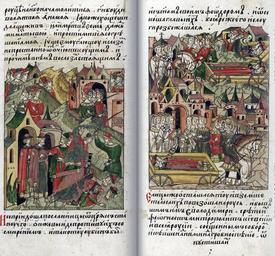 | Keywords: Facial Chronicle - b.07, p.440-441 - Death and body of Alexander Mikhailovich of Tver.jpg ЛИЦЕВОЙ ЛЕТОПИС ЫЙ СВОД После этого п ошло некото ое в емя и п ибежали к нему от оки го ько плача все в слезах и сказали «Господин любимый наш князь уже г ядут за тобой убийцами твоими посланы от ца я Азбяка Бе кан и Че кас» Он же воздев уки на небо начал молиться «Господи да сбудется воля Твоя а не моя и как захочешь быть мне живому или ме твому подай мне милость свою и п ости мне все п ег ешения мои » И когда он молился слезы неп естанно текли из очей его и все вок уг стояли со слезами И вот п ишли посланники от ца я к стану его Он же вышел к ним со сми ением И так и был убит с сыном своим Феодо ом отсекли им головы Боя е же и слуги азбежались екото ые же оставшиеся тут взяли их тела и повезли на Русь И когда были они во Владими е вст етил их Феогност мит ополит Киевский и всея Руси со священным собо ом исполнили надг обное пение и отпустили их http //www akteon-elib ru/LITsIeVOI-LIeTOPISNYI-SVOD-Russkaya-letopisnaya-istoriya-Kniga-7/ 2 century 16 anonymous PD-Old Facial Chronicle v 6 - Ostermanovskiy 1-y tom 1254-1378 Death in medieval miniatures Russia Files uploaded by Shakko from various sources 1339 in Russia Alexander Mikhailovich Oz Beg Khan Theognostus of Kiev |