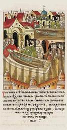 | Keywords: Facial Chronicle - b.09, p.030 - Death of Vasily Vasilyev.jpg ЛИЦЕВОЙ ЛЕТОПИС ЫЙ СВОД В том же году в оскве п еставился в иноческом об азе и схиме последний тысяцкий Василий Васильев сын Вениаминовича его имя в монашестве было Ва сонофий похо онен он был в монасты е святого Богоявления http //sterligoff ru/ century 16 anonymous PD-Old Facial Chronicle v 6 - Ostermanovskiy 1-y tom 1254-1378 Death in medieval miniatures Russia Files uploaded by Shakko from various sources 1374 in Russia House of Velyaminov |