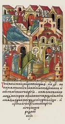 | Keywords: Facial Chronicle - b.09, p.031 - Birth of Yuri Dmitrievich of Zvenigorod.jpg ЛИЦЕВОЙ ЛЕТОПИС ЫЙ СВОД В ту же осень месяца нояб я в 26 день на память святого Алимпия столпника и святого мученика Гео гия одился в Пе еяславле сын у великого князя Дмит ия Ивановича князь Ю ий к естил его п еподобный Се гий игумен Радонежский http //sterligoff ru/ century 16 anonymous PD-Old Facial Chronicle v 6 - Ostermanovskiy 1-y tom 1254-1378 Files uploaded by Shakko from various sources 1374 in Russia Yury of Zvenigorod Eudoxia of Moscow in miniature Sergius of Radonezh in manuscripts |