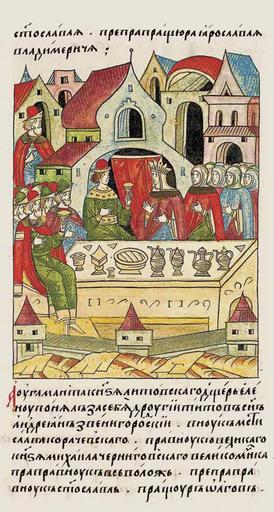 | Keywords: Facial Chronicle - b.09, p.128 - Wedding of Andrey of Zvenigorod and Helena Holszanski.jpg ЛИЦЕВОЙ ЛЕТОПИС ЫЙ СВОД А дочь князя Литовского Гаманта Елену взял за себя д угой сын Тита Анд иан Звениго одский внук стислава Ко ачевского п авнук великомученика великого князя ихаила Че ниговского п ап авнук» Всеволода п еп ап авнука Святослава потомка п ащу а Олега п ап ащу а Святослава п еп ап ащу а Я ослава Владими овича http //sterligoff ru/ century 16 anonymous PD-Old Facial Chronicle v 6 - Ostermanovskiy 1-y tom 1254-1378 Files uploaded by Shakko from various sources Weddings in medieval manuscripts Russia Andrey of Zvenigorod Halšanski family |