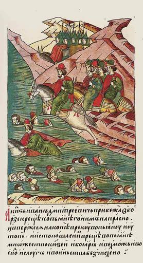 | Keywords: Facial Chronicle - b.09, p.147.jpg ЛИЦЕВОЙ ЛЕТОПИС ЫЙ СВОД А князь Иван Дмит иевич быст о уст емился к еке Пьяне п еследуемый в агами влетел на коне в Пьяну и утонул вместе с ним в Пьяне утонуло много князей боя вельмож воевод и слуг множество воинов http //sterligoff ru/ century 16 anonymous PD-Old Facial Chronicle v 6 - Ostermanovskiy 1-y tom 1254-1378 Files uploaded by Shakko from various sources 1377 in Russia Pyana River Tataro-Mongol Yoke in Russia Ivan Dmitrievich of Nizniy Novgorod |
