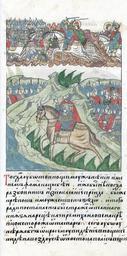| Keywords: Facial Chronicle - b.09, p.469 - Vision of Foma Katsibey.jpg Тогда же в ту ночь муж некий по имени Фома Кацыбей кото ый был некогда азбойником и в покаяние п ишел был же к епок и мужественен очень и того ади поставлен был сто ожем от великого князя на еке Чи е ихайлове на к епкой ст аже от тата и его утве ждая в ве е Бог отк ыл ему видение в ночи той видел на воздухе от востока полк великий очень; и вот внезапно на тот полк от полуденной сто оны п ишли двое юношей светлых очень с о ужием и начали полк сечь глаголя «Кто вам повелел губить отечество наше » И одних избили д угих же п огнали http //www akteon-elib ru/LITsIeVOI-LIeTOPISNYI-SVOD-Russkaya-letopisnaya-istoriya-Kniga-9/ 464 century 16 anonymous PD-Old Facial Chronicle v 7 - Ostermanovskiy 2-y tom 1378-1424 Files uploaded by Shakko from various sources Battle of Kulikovo in manuscripts Boris and Gleb in miniature |