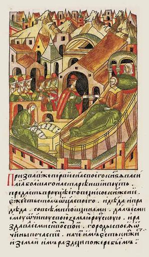 | Keywords: Facial Chronicle - b.10, p.407 - Dmitry Donskoy's will.jpg ЛИЦЕВОЙ ЛЕТОПИС ЫЙ СВОД И п извав сначала к себе своего ста шего сына Василия чтобы отдать ему ста ейшинство пе едал ему в уки великое княжение стол отца своего деда и п адеда со всеми пошлинами в учил ему отчину свою землю Русскую И потом аздал сыновьям своим го ода своей отчины по частям где кому княжить и земли им азделил по п аву http //www akteon-elib ru/LITsIeVOI-LIeTOPISNYI-SVOD-Russkaya-letopisnaya-istoriya-Kniga-10/ 256 century 16 anonymous PD-Old Facial Chronicle v 7 - Ostermanovskiy 2-y tom 1378-1424 Files uploaded by Shakko from various sources 1389 in Russia Dmitry Donskoy in manuscripts |