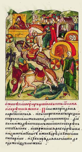 | Keywords: Facial Chronicle - b.11, p.194 - Vladimirskaya icon and Andrey Bogolubskiy.gif О жене кото ая была убита конем и ожила Это случилось когда люди п иехали на Ро- гожские поля И жена выше упомянутого п есвите а иколы хотела сойти с повоз- ки По дьявольскому же наущению конь стал неистово сви еп- ствовать и сб осил с себя аба е еова сломал ему ногу а жену ие ея ногами затоптал и схватив зубами волочил ее по земле пока она не пе естала дышать http //www runivers ru/bookreader/book480116/ page/129/mode/1up century 16 anonymous PD-Old Files uploaded by Shakko from various sources Facial Chronicle v 7 - Ostermanovskiy 2-y tom 1378-1424 Our Lady of Vladimir in art Andrei Bogolyubsky in miniature |
