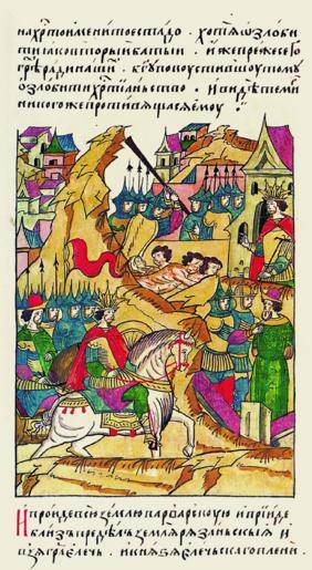 | Keywords: Facial Chronicle - b.11, p.255 - Timur taking Elets.gif О взятии го ода Елец- ка И азго евшись я остью и возго див- шись де знул окаян- ный Теми унизить ве у х истианскую и святых Божиих угод- ников святых усских чудотво цев особенно великого в святителях чудотво ца Пет а И пошел на Русскую землю на х истианское стадо желая полонить ее как вто ой Батый кото ому до этого из- за г ехов наших Бог попустил полонить х истианство Теми видя что никто не п отивится ему п ошел всю землю ва ва скую и дойдя до п еделов земли Рязанской взял го од Елецк князя Елецкого пленил людей замучил так как зол был и лют этот гонитель х истиан жесток и немилостив http //www runivers ru/bookreader/book480116/ page/242/mode/1up century 16 anonymous PD-Old Files uploaded by Shakko from various sources Facial Chronicle v 7 - Ostermanovskiy 2-y tom 1378-1424 Timur in manuscripts 1395 in Russia Yelets |