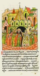 | Keywords: Facial Chronicle - b.15, p. 426 - Ivan III and Sophia's wedding.gif И отслужив обедню венчал благове ного великого князя Ивана Васильевича всея Руси с п авославной ца- евной Софьей с до- че ью Фомы деспота Аммо ейского; а тот Фома сын ца я ануила Ца ьг адско- го б ат же ца я Ивана Калуяна и Дмит ия и Константина Были же на венчании их мать великого князя великая княгиня а ия и сын его Иван и б атья его благове ные князья Анд ей и Бо ис и Анд ей со всеми п очими князьями и боя ами своими и множество на ода и тот посол им- ский легат Антоний со своими имлянами и Дмит ий Г ек посол от ца евичей б атьев ца евны от Анд ея и ануила и п очие с ним г еки и многие г еки кото- ые п ишли служить ца евне http //www runivers ru/bookreader/book480451/ page/25/mode/1up century 16 anonymous PD-Old Facial Chronicle v 8 - Shumilovskiy tom 1425; 1478-1533 Files uploaded by Shakko from various sources 1472 in Russia Sophia Palaiologina Philipp I Metropolitan of Moscow Ivan III of Russia in miniature Maria Yaroslavna of Borovsk in miniature Andrey Vasilyevich Goryay in miniature Andrey Vasilyevich the Younger Boris Vasilyevich of Volotsk Weddings in medieval manuscripts Russia |